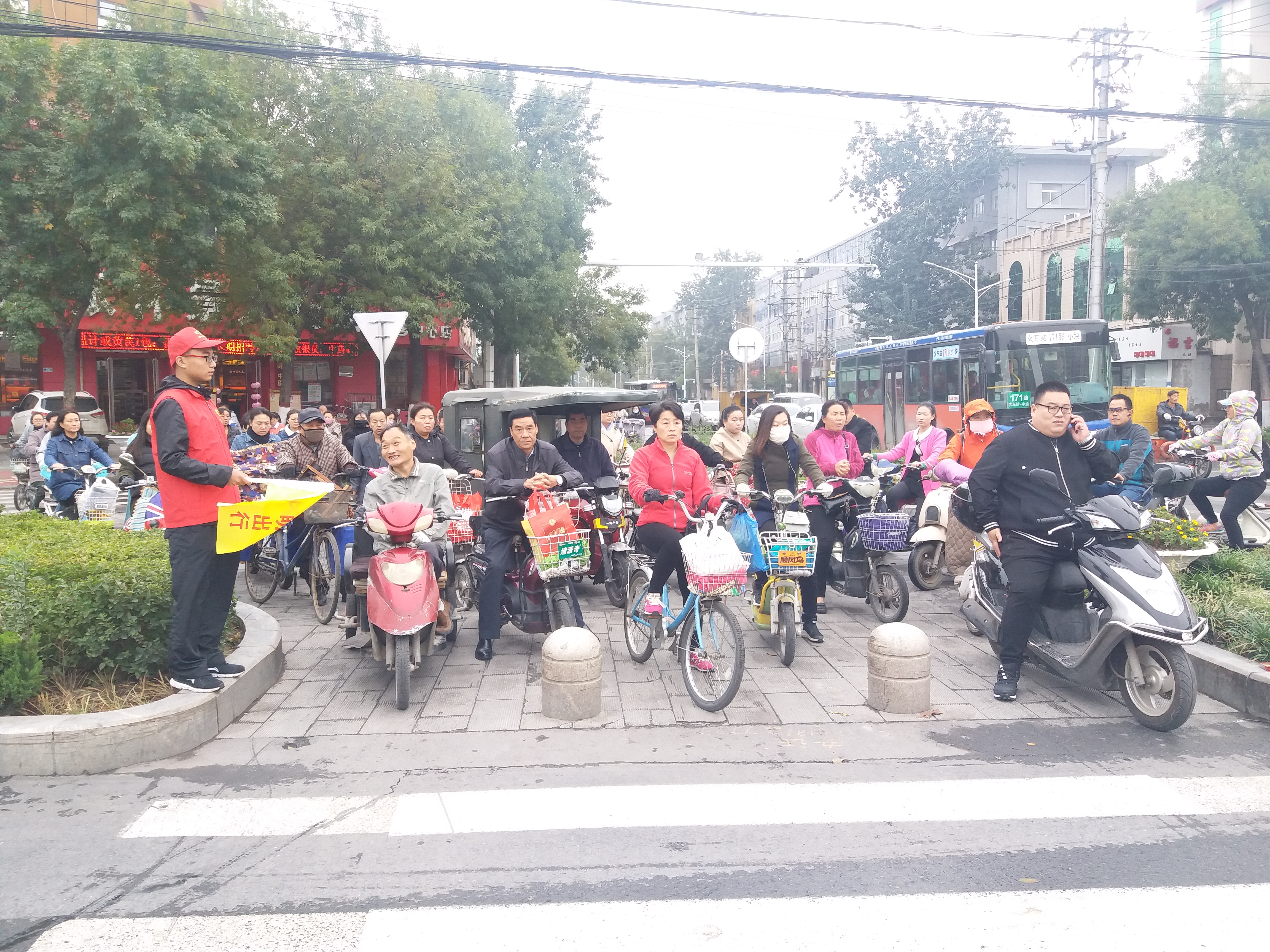 活动中,志愿者穿戴红色志愿服务衣帽,两人一组在路口四个方向,手持引导牌,向过往路人宣传文明交通。在执勤活动中,志愿者维护路口交通秩序,疏导交通,劝导纠正非机动车和行人闯红灯,耐心劝阻横穿马路、乱闯红灯、翻越护栏、上下车不排队等不文明行为,并对违反交通规则的行人进行劝阻,教育引导广大市民遵守交通法规,文明行路、文明行车。宏力大道与胜利路交叉路口是城区交通比较繁忙的路段,交通复杂,人流量大,但是,一张张温馨的笑脸,一句句恳切地话语,在市区街头形成了一道亮丽的风景线。此次志愿活动我院志愿者秉承“互助友爱进步奉献”的志愿精神,身体力行劝导过往市民积极参与创建全国文明城市活动,以身作则,自觉提高文明交通意识,培养良好交通习惯,共同构建平安、有序、文明的交通环境。