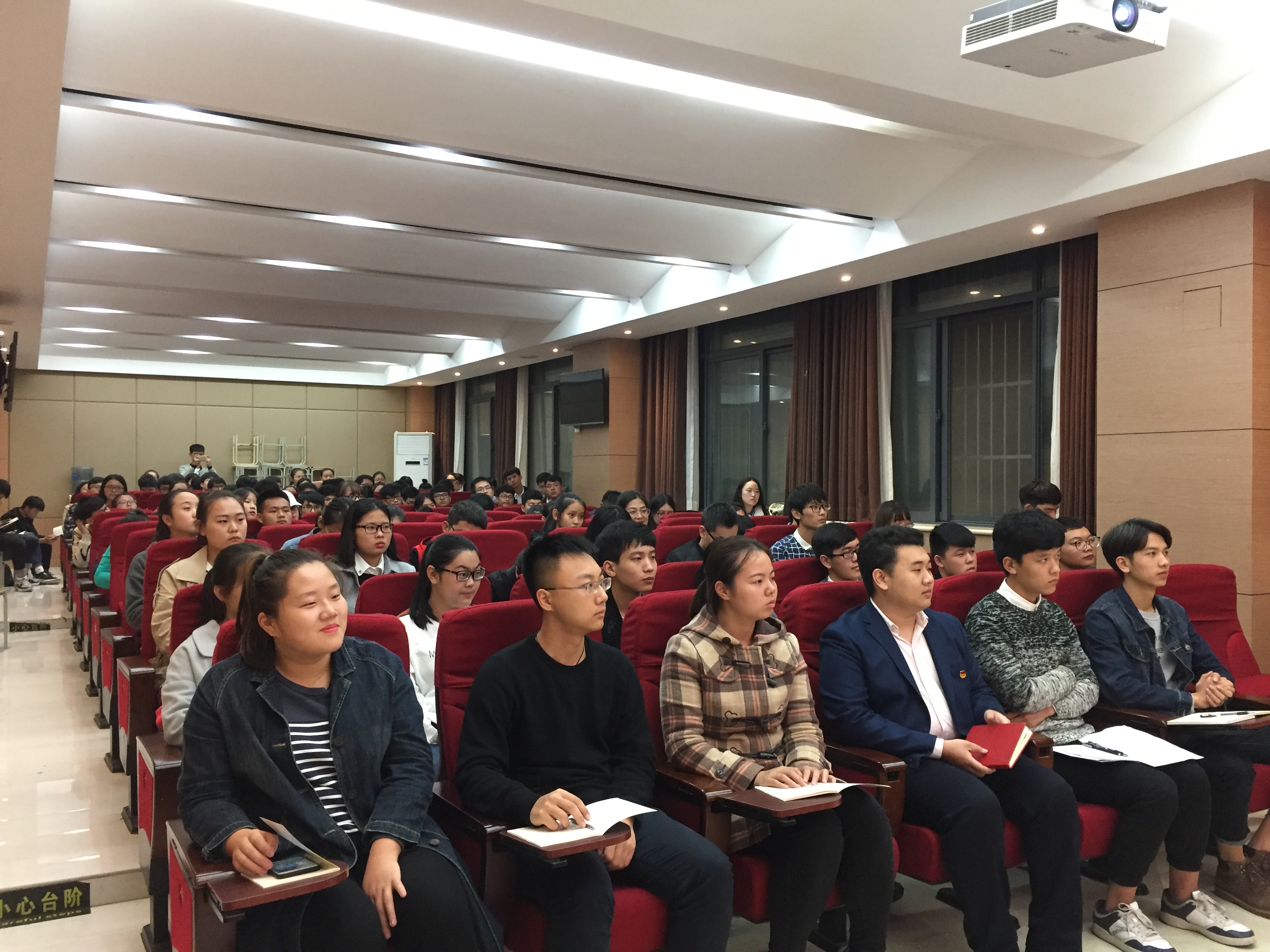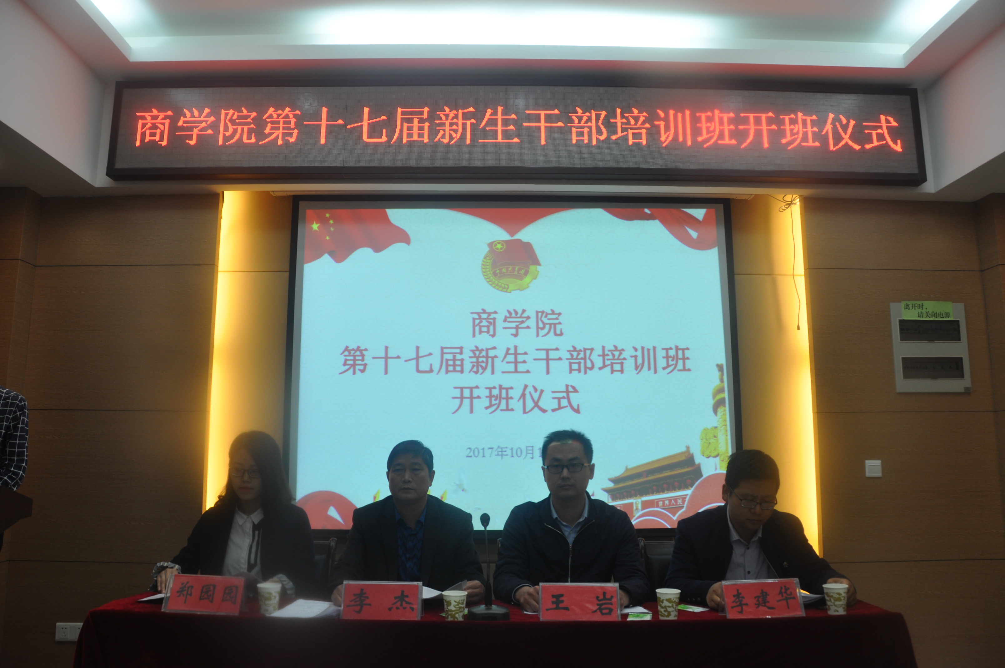 10月19日晚7点,商学院第十七届新生干部培训班开班仪式于商院楼119报告厅隆重举行。商学院党委书记李杰、院团委书记兼2015级辅导员王岩、院办公室副主任兼2017级辅导员李建华、2016级辅导员郑园园受邀出席本次大会。我院2017级全体新生干部到场学习聆听。