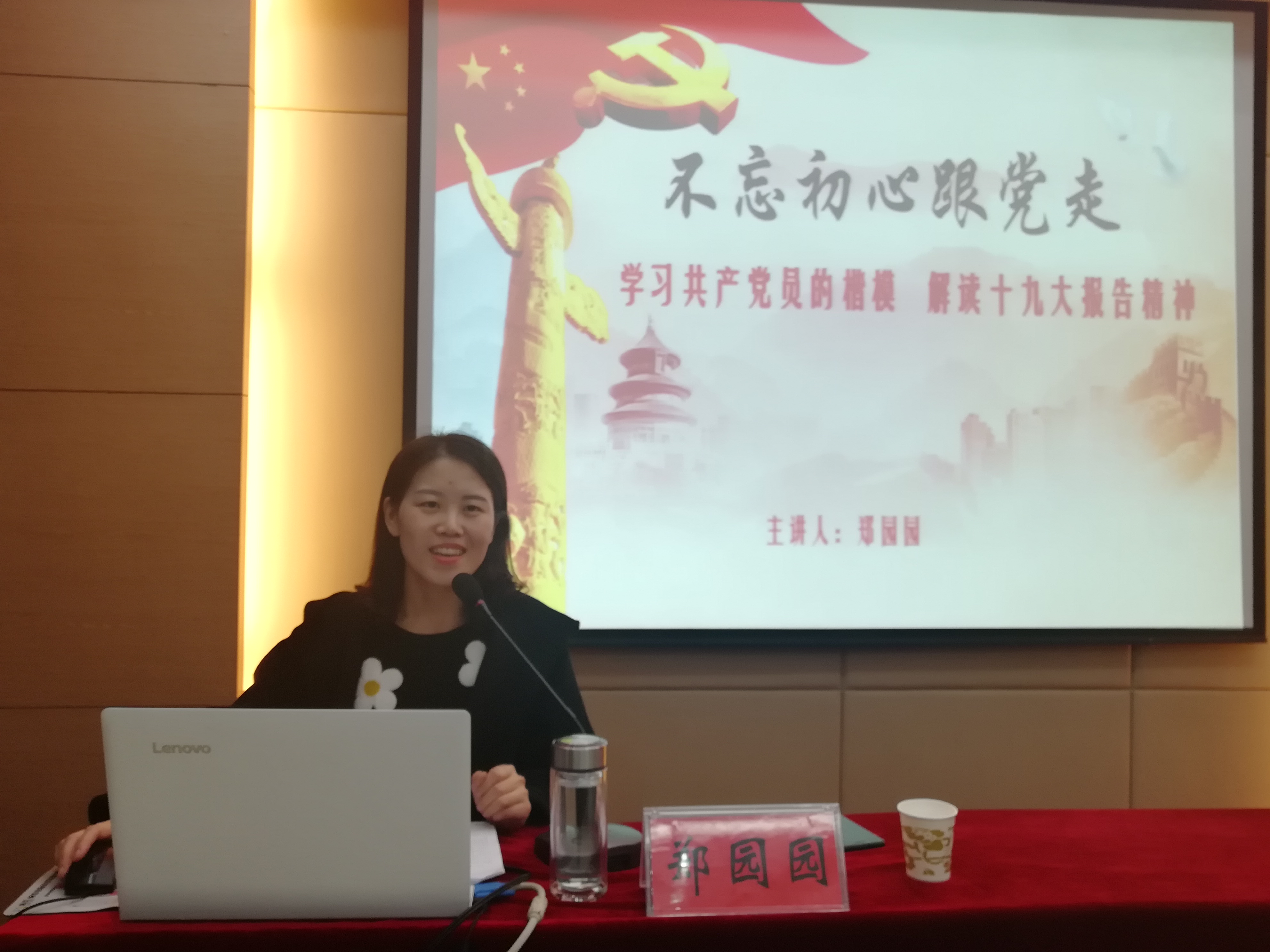 讲座伊始,由一个介绍优秀共产党代表——史来贺的微党课视频进入讲座的主题――“学习共产党的楷模,解读十九大报告精神”。本次会议中,郑老师从什么是合格的共产党员,为什么要成为共产党员,如何成为合格的共产党员三个部分向同学们展开对十九大报告的解读。郑老师通过介绍史来贺生平中的“与群众签订不平等条约”“住房改造”“带头卖平价棉”等先进事迹,向同学们传达了一个合格优秀的共产党员必须具备的三点精神品质:一诺千金、听党的话、不怕吃亏。郑老师强调,青年学生要有坚定的政治立场,选择了党就是选择政治信仰,一个合格的共产党员要具备责任担当意识和牺牲奉献精神,时刻坚守自身职责,忠于党和人民,同时,她对入党流程进行了简单介绍。最后,郑老师特别强调了十九大报告中习近平总书记提出的关键词“青春梦想”,希望同学们向习近平总书记要求的那样坚定政治信念,尊重历史,展望未来,积极进取争当有理想有信念有追求的青年干部,在实现中国梦的征程中放飞青春梦想。