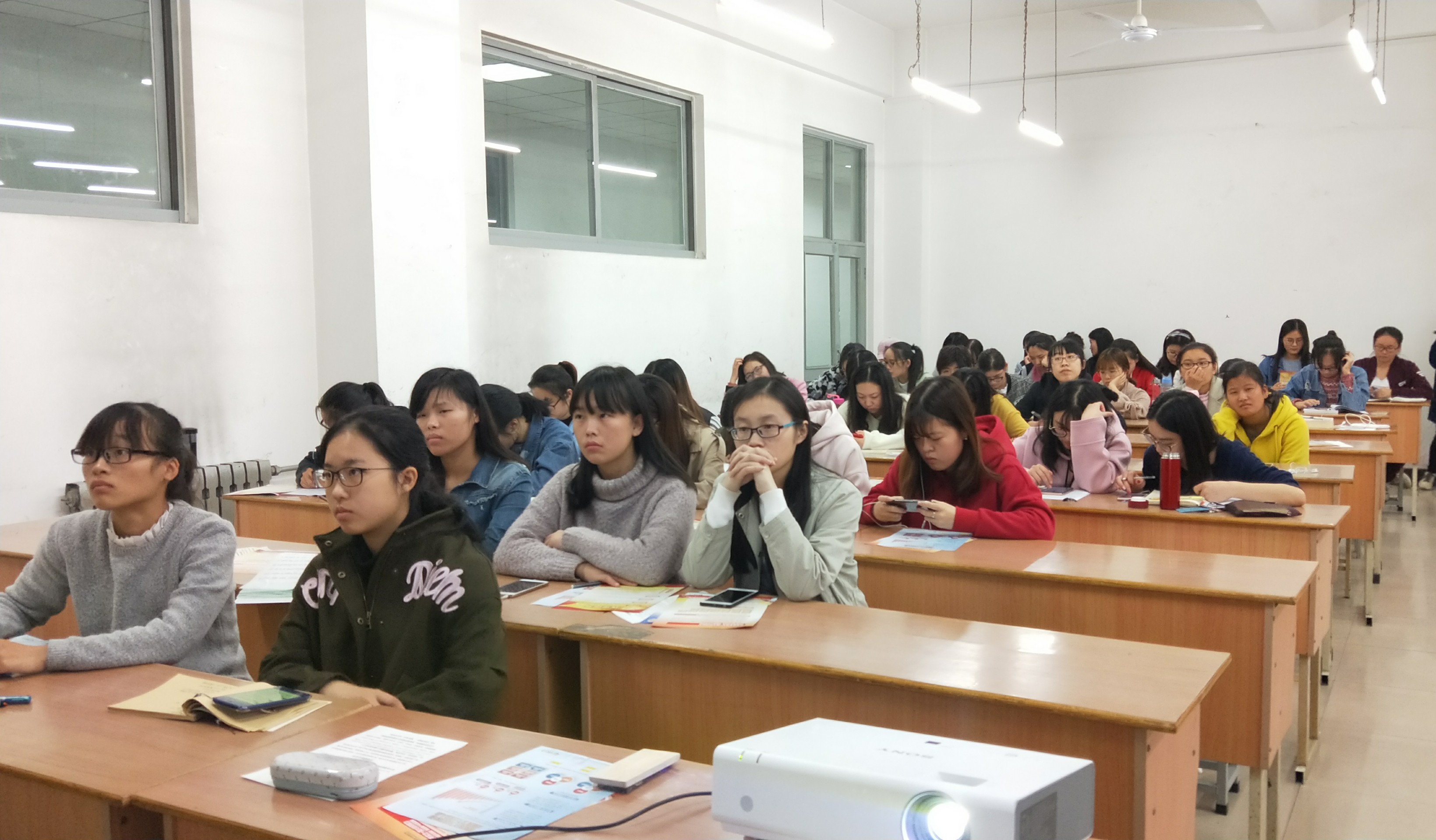 11月7日晚,商学院团委学生会实践部举办的中国人寿校园招聘宣讲会于东教区A楼302教室顺利举行。中国人寿新乡分公司城区销售部经理马瑞红和高级组经理何佳萌受邀担任本次宣讲会主讲人。商学院2014级,2015级部分同学到场认真聆听,全场座无虚席。