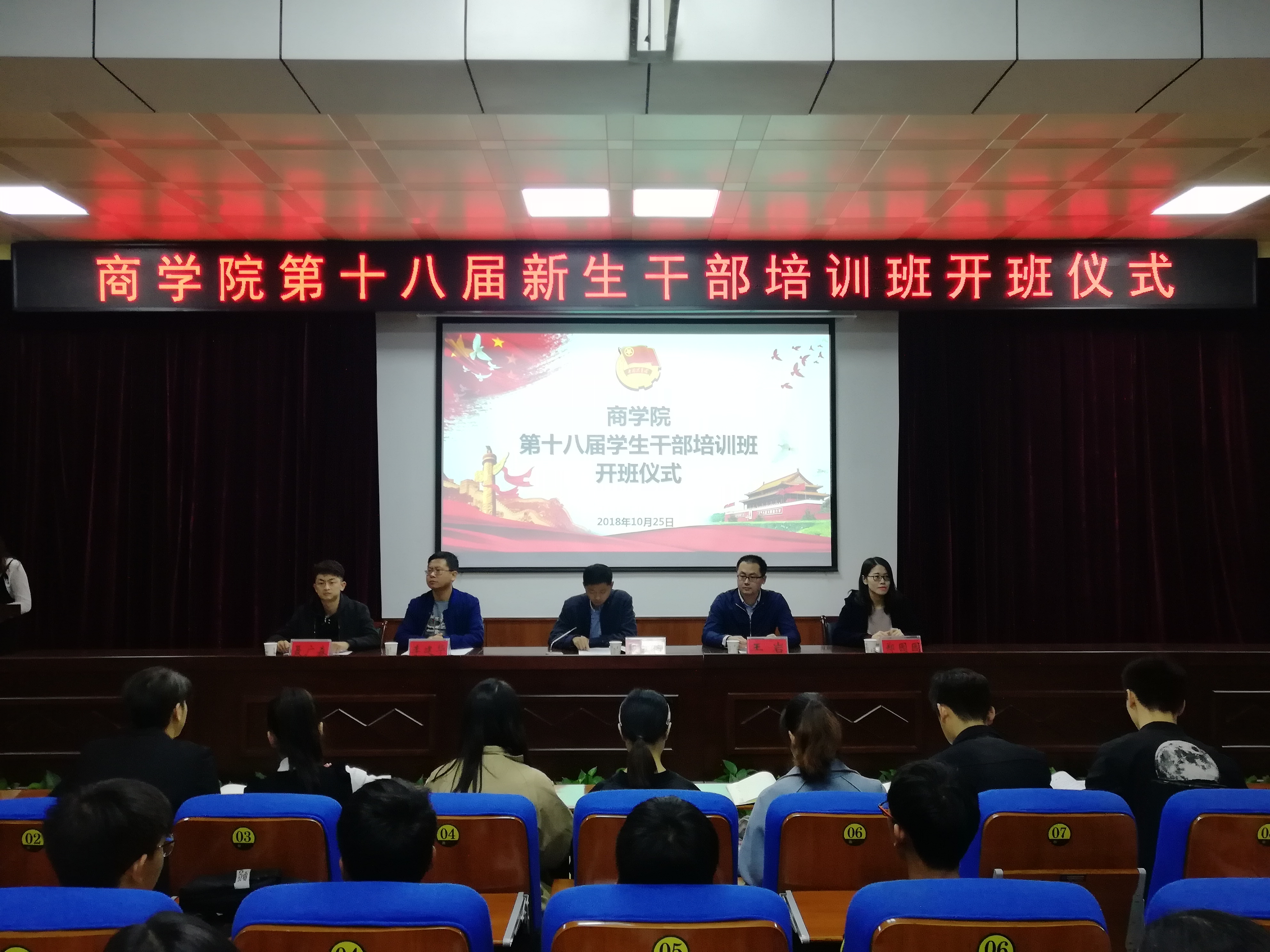 为深化学生干部队伍建设,提升全方位、全过程育人成效,10月25日晚七时,商学院第十八届新生干部培训班开班仪式暨开班第一课在党校教室顺利举行。商学院学生工作相关负责人受邀出席本次大会,学院2018级全体新生干部参会学习。