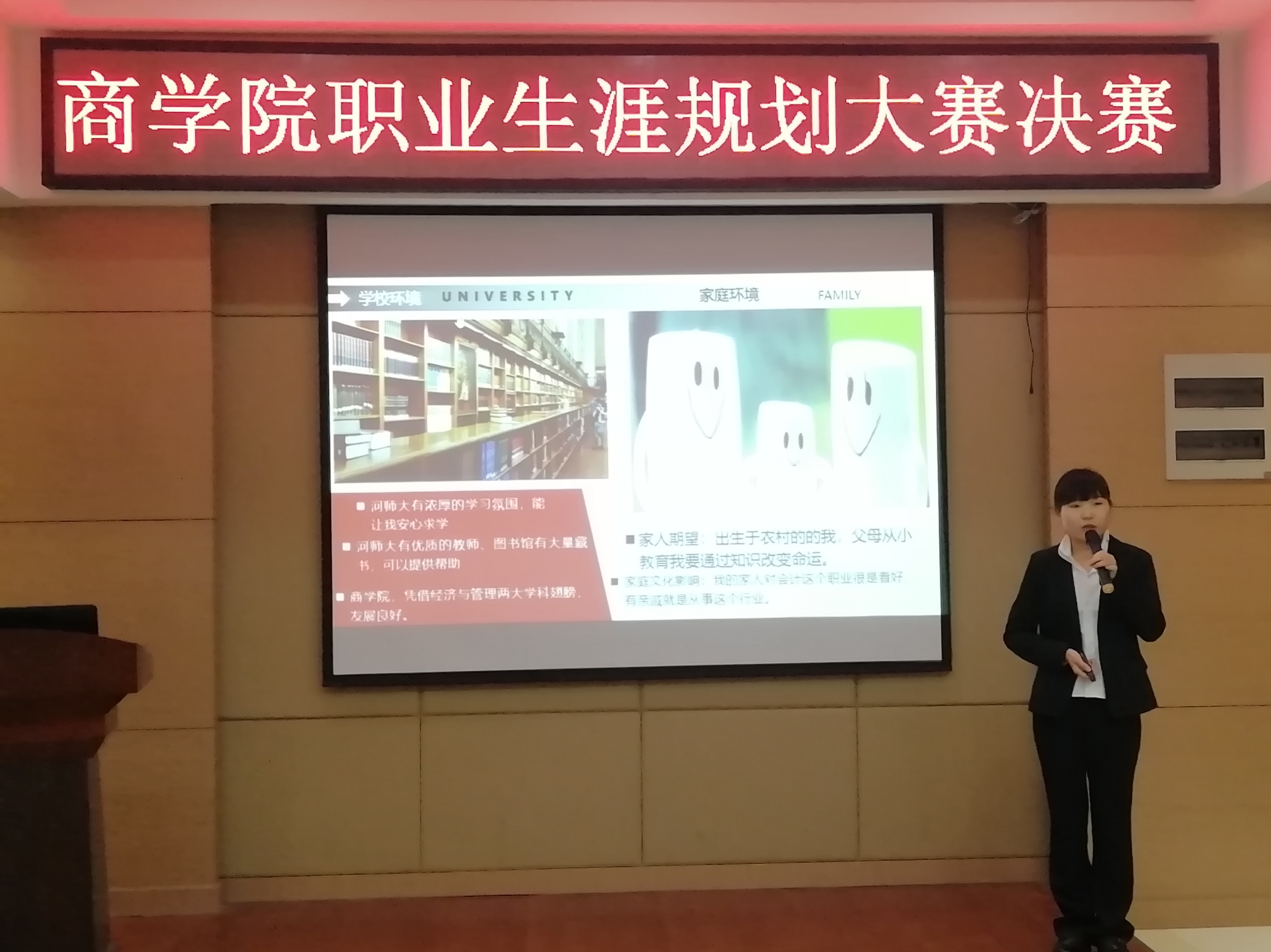 为了坚定大学生的理想信念,帮助大学生合理规划自己的人生,11月2日晚7时,商学院于商院楼119会议室举办职业生涯规划大赛决赛。“饿了么”新乡分公司人力资源部经理赵彬、中信证券新乡营业部经理雷永鹏以及商学院学生工作相关负责人受邀担任本次比赛的评委。商学院2017级、2018级部分同学参加了此次比赛。