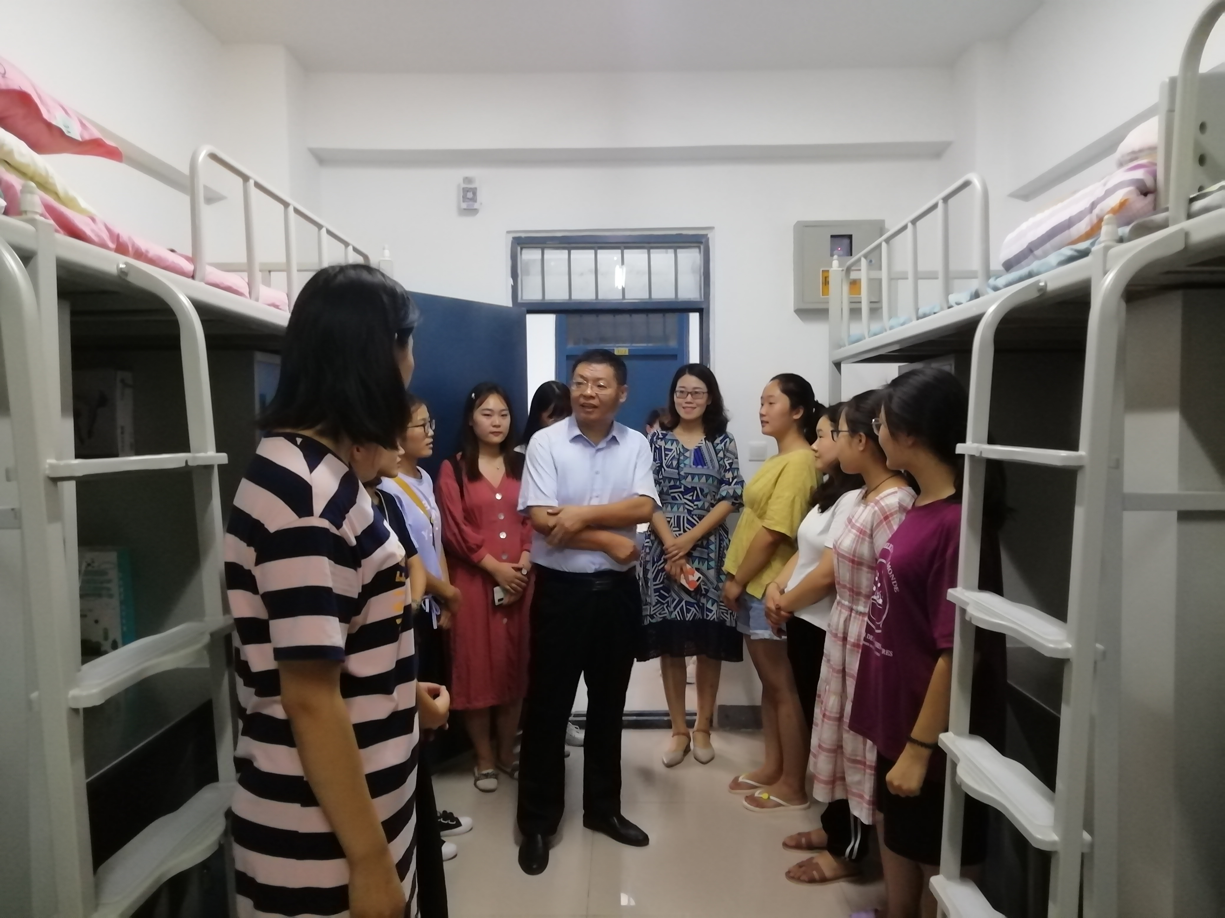 9月8日下午,商学院全体领导班子和各年级辅导员前往宿舍慰问2019级新生,帮助他们尽快适应新的学习和生活环境,并对新生生活用品、安全、宿舍环境等方面进行检查,确保新生入学有良好的生活环境。