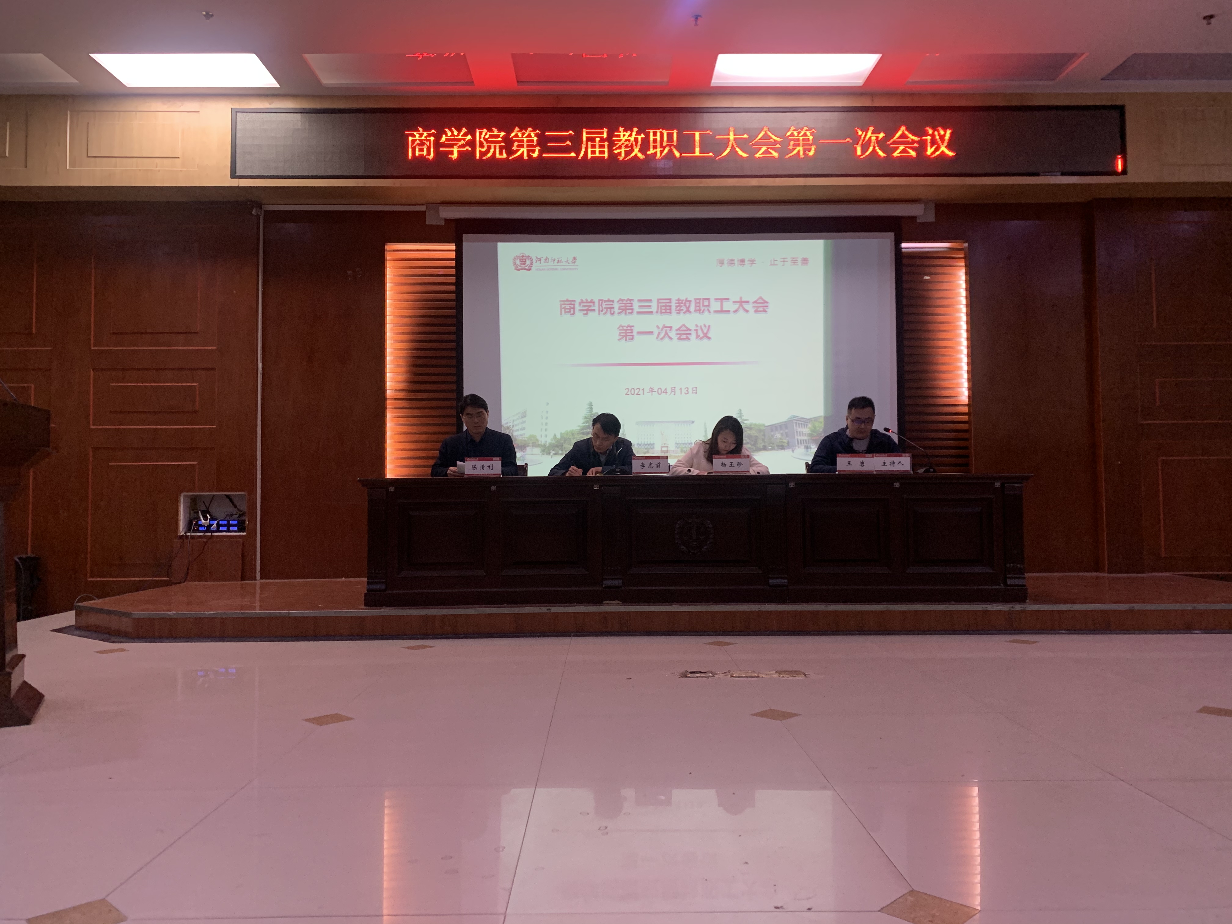 4月13日下午,商学院在模拟法庭召开了第三届教职工大会第一次会议,学院全体领导班子成员出席会议,91名工会会员参加会议,会议由学院分工会副主席王岩主持。