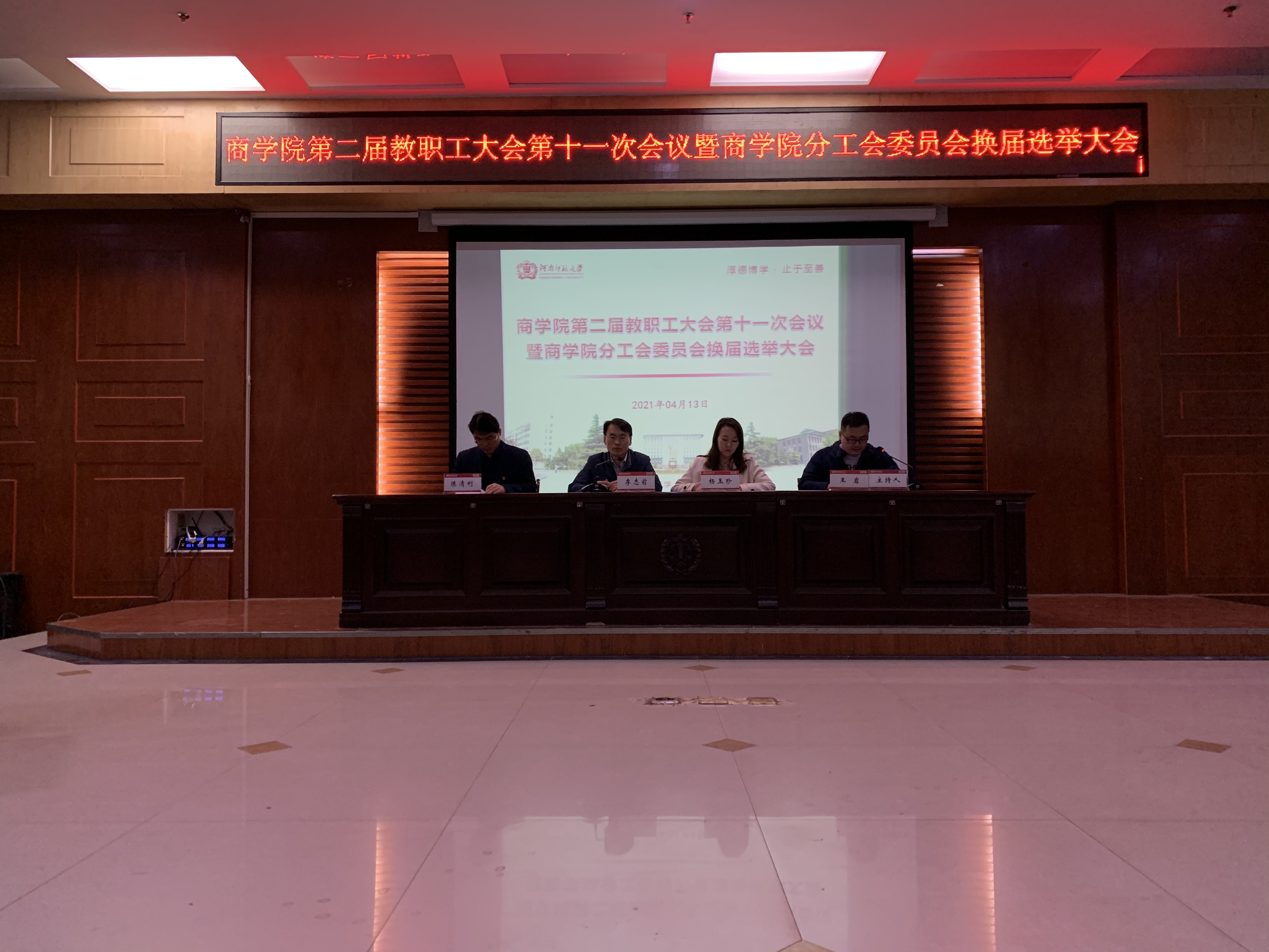 4月13日下午,商学院在模拟法庭召开了分工会委员会换届选举大会,学院全体领导班子成员出席会议,91名工会会员参加会议。会议由现任学院分工会副主席王岩主持。