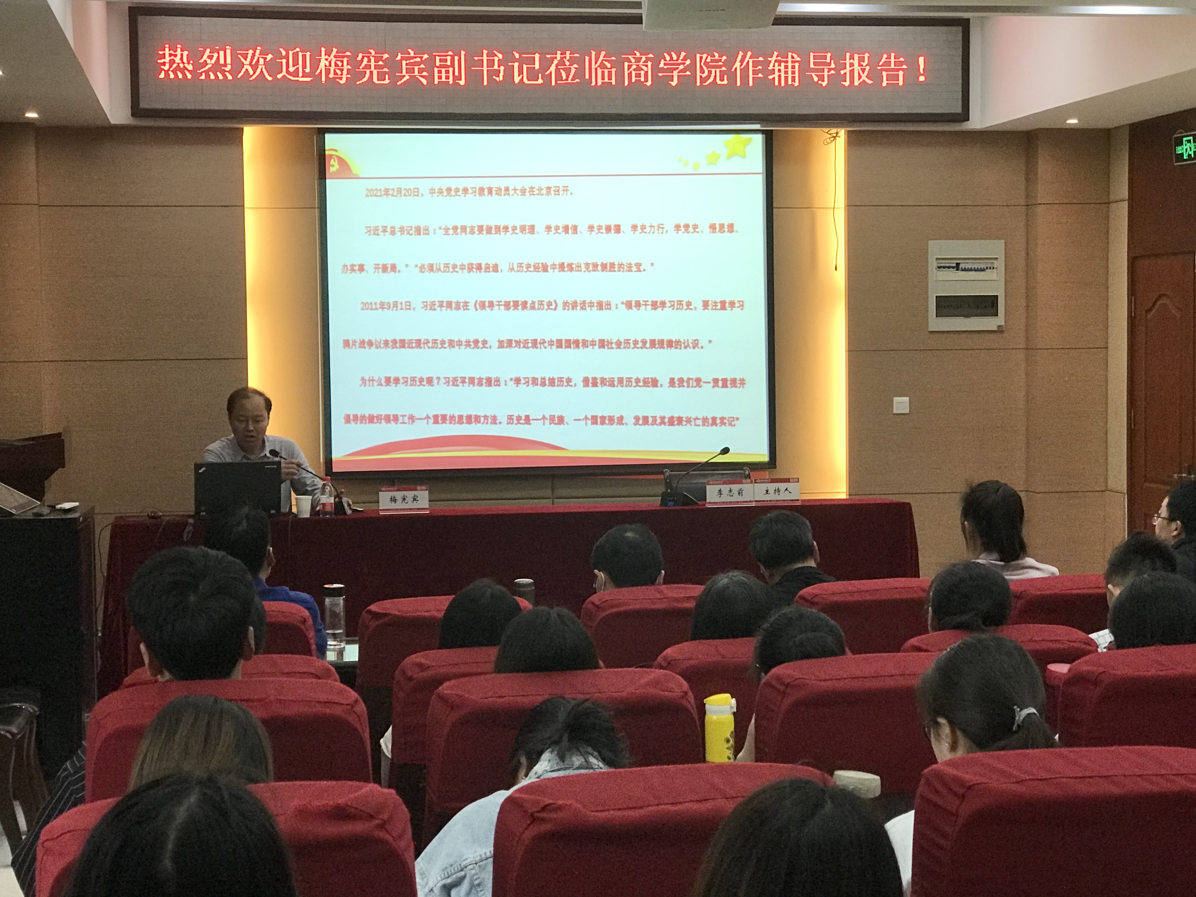 为深入贯彻落实习近平总书记关于党史学习教育的重要讲话精神,推动学院党史学习教育深入开展,5月7日,校党委副书记、工会主席梅宪宾以《党史与党的理论创新》为题,为商学院师生作党史学习教育专题辅导报告。学院领导班子、全体党支部书记及师生党员代表90余人参加了报告会。报告会由学院党委书记李志前主持。