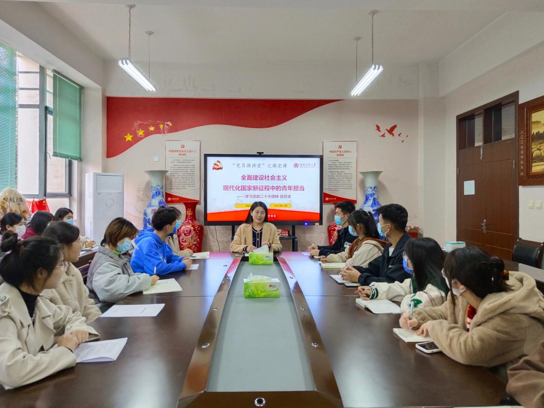各支部围绕党的二十大报告内容,通过讲授专题党课和“微党课”的形式,为全体党员上了一堂堂生动而深刻的党课。其中,教工行政党支部书记陈清利以《学思践悟凝共识,团结奋进谋发展》为题,解读了报告的主要内容,从宏观和微观层面提出了落实党的二十大精神的具体任务;本科生第五党支部书记杨娜以《立鸿鹄之志,做奋斗青年》为题,号召党员以理想者、担当者、吃苦者、奋斗者的姿态,奋进新征程,诠释新青春。本科生第三党支部书记郑园园通过“党员微讲堂”党建平台,为党员讲授“微党课”,并开展“学习党的二十大精神‘微研讨’”,引导党员用青春奋斗汇聚起全面建设社会主义现代化国家的磅礴力量。