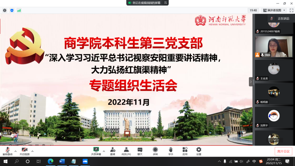 按照河南省委教育工委《关于以“深入学习习近平总书记视察安阳重要讲话精神,大力弘扬红旗渠精神”为主题召开专题组织生活会的通知》要求和学校党委的工作安排,2022年11月15日至11月26日,学院党委10个党支部以线上线下相结合的方式,分别召开专题组织生活会,领导班子成员以党员身份参加。