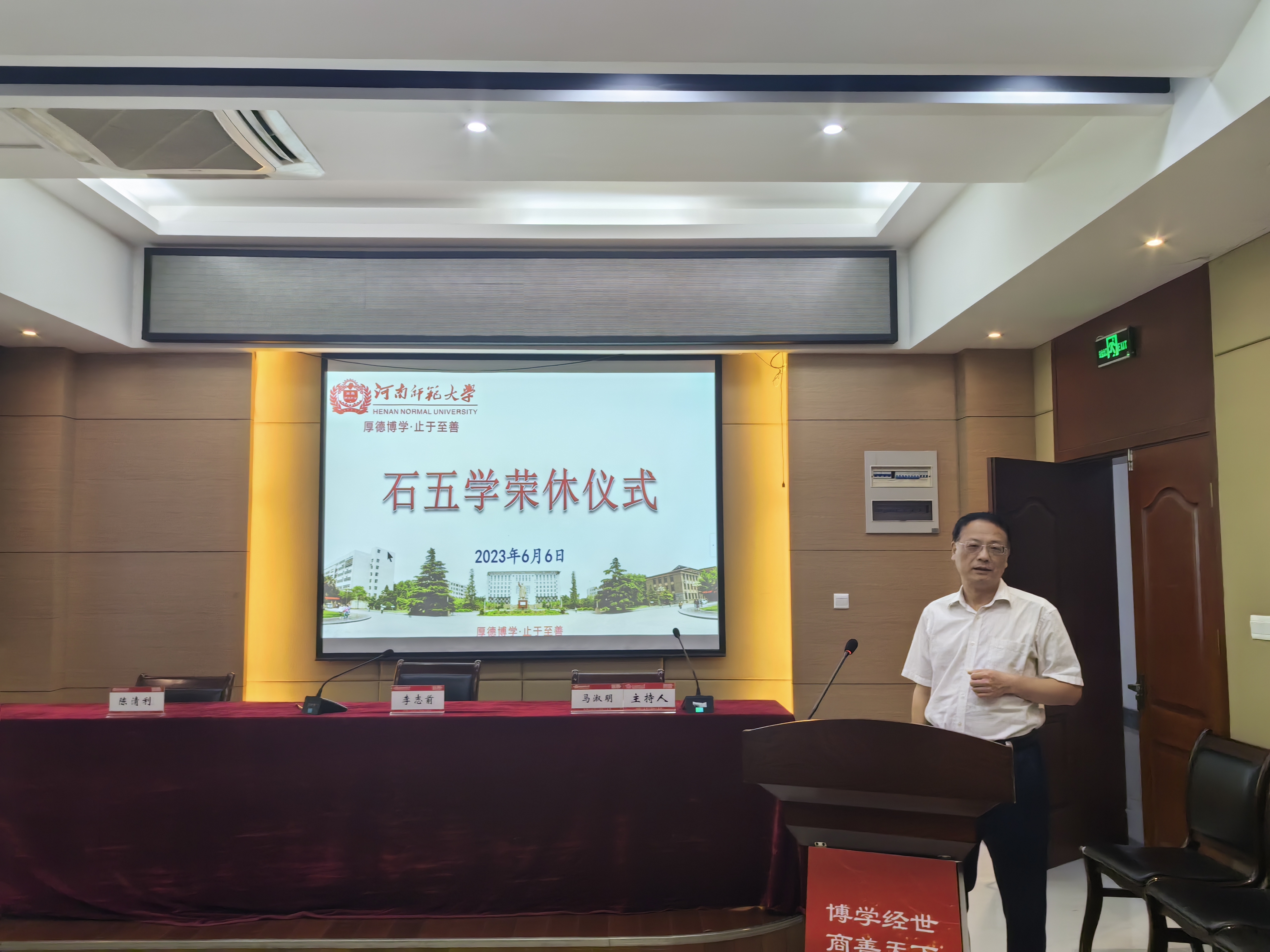 学院党委书记李志前介绍了石五学老师工作四十年的基本情况,肯定了他对学院各项事业发展做出的巨大贡献,他讲到荣休教师是学院无形和无价的宝贵财富,希望荣休教师老有所乐、老有所为,在积极愉快面对全新退休生活的同时,发展余热、续写春秋。希望全体教师能将石老师的精神薪火相传,赓续初心,在求索中奋进,在力拓中创新。