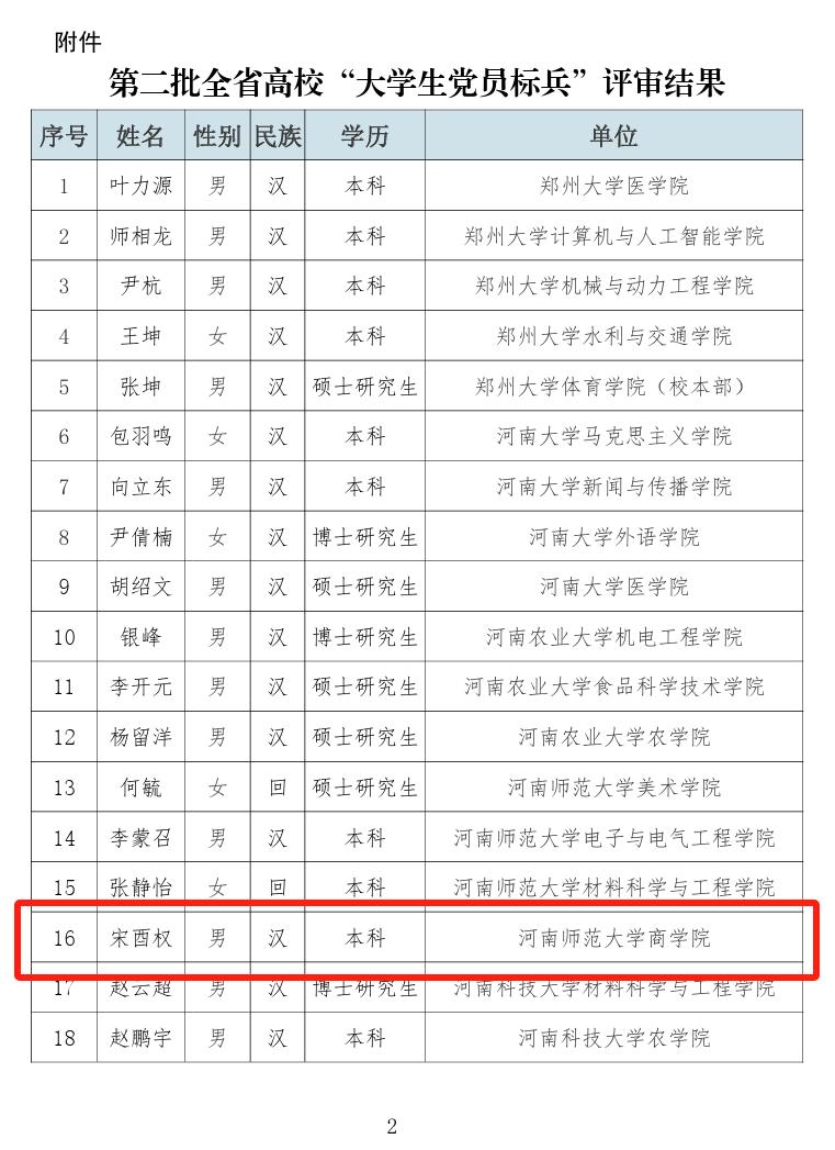 近日,中共河南省委教育工委关于选树第二批全省高校“大学生党员标兵”的评审结果公示,经高校遴选、推荐、专家评审,拟认定第二批全省高校“大学生党员标兵”100名,我院2020级本科生宋酉权同学入选。