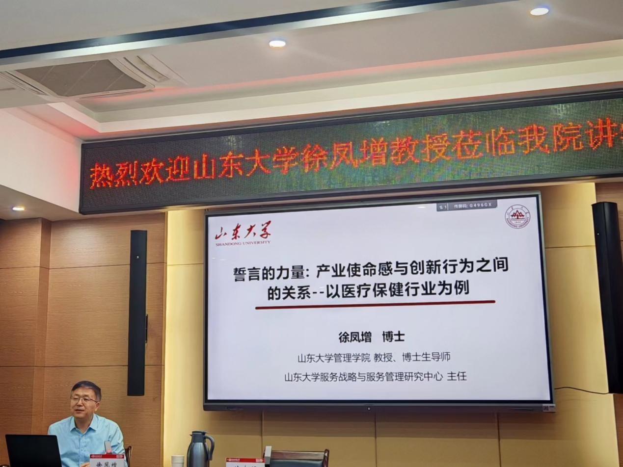 4月23日上午,山东大学徐凤增教授应邀在商学院一楼会议室为师生进行了《誓言的力量:产业使命感与创新行为之间的关系——以医疗保健行业为例》的专题报告。工商管理学科教师和学生代表80余人参加,海本禄副院长主持。