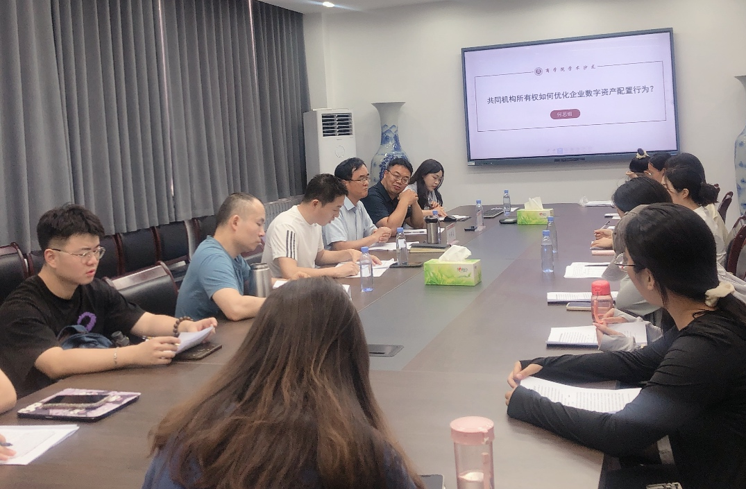 何思锦博士围绕选题背景、文献综述与理论分析、研究设计、实证结果、机制分析等部分内容对论文进行介绍。论文点评环节,张广根副教授、张秀峰副教授和朱曼博士分别从论文题目、研究视角、数字资产配置同群效应实现机制、研究启示针对性等方面对文章提出专业且全面的修改建议。与会教师也都积极发表对汇报论文的看法,讨论气氛积极热烈。