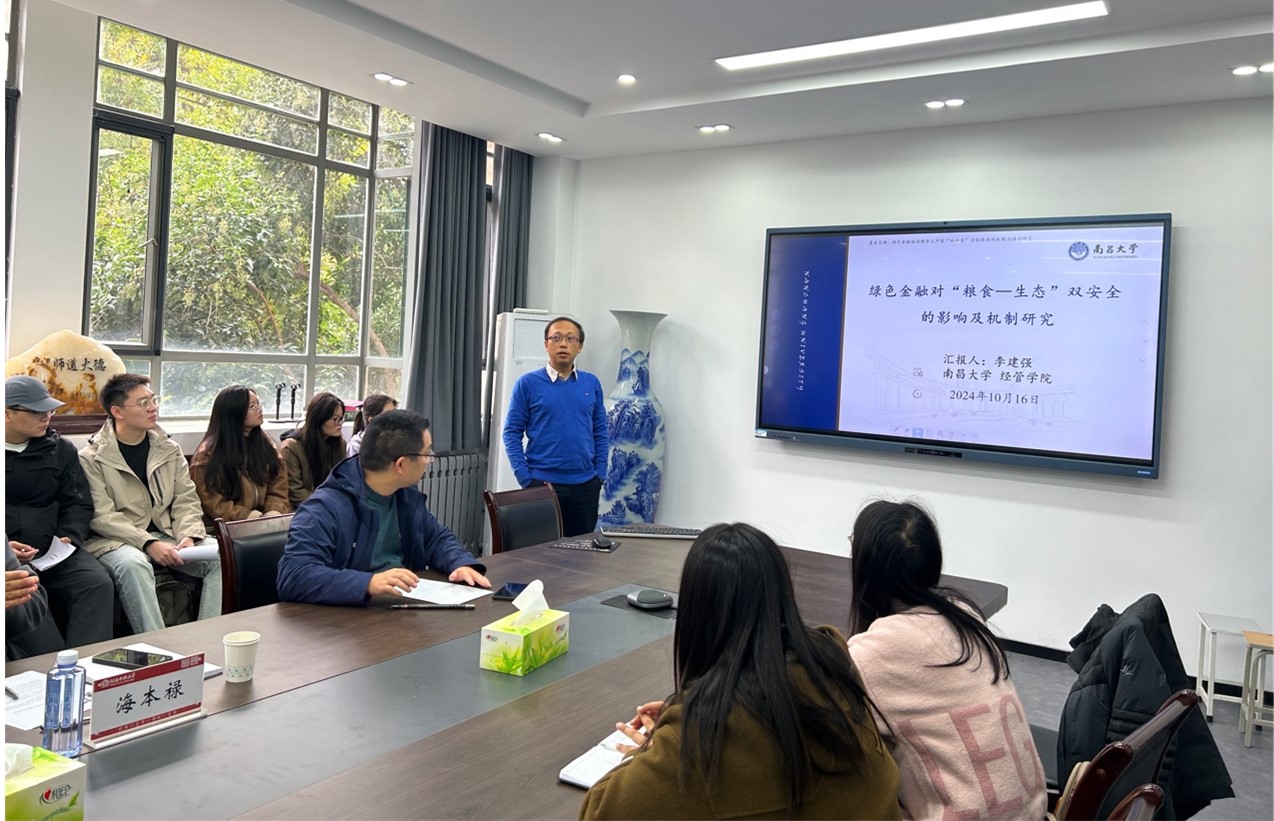 10月21日,南昌大学博士生导师李建强教授应邀在商学院二楼会议室为学院骨干教师和研究生代表40余人,作了题为“绿色金融对‘粮食—生态’双安全的影响及机制研究”的学术报告,报告由商学院副院长海本禄主持。