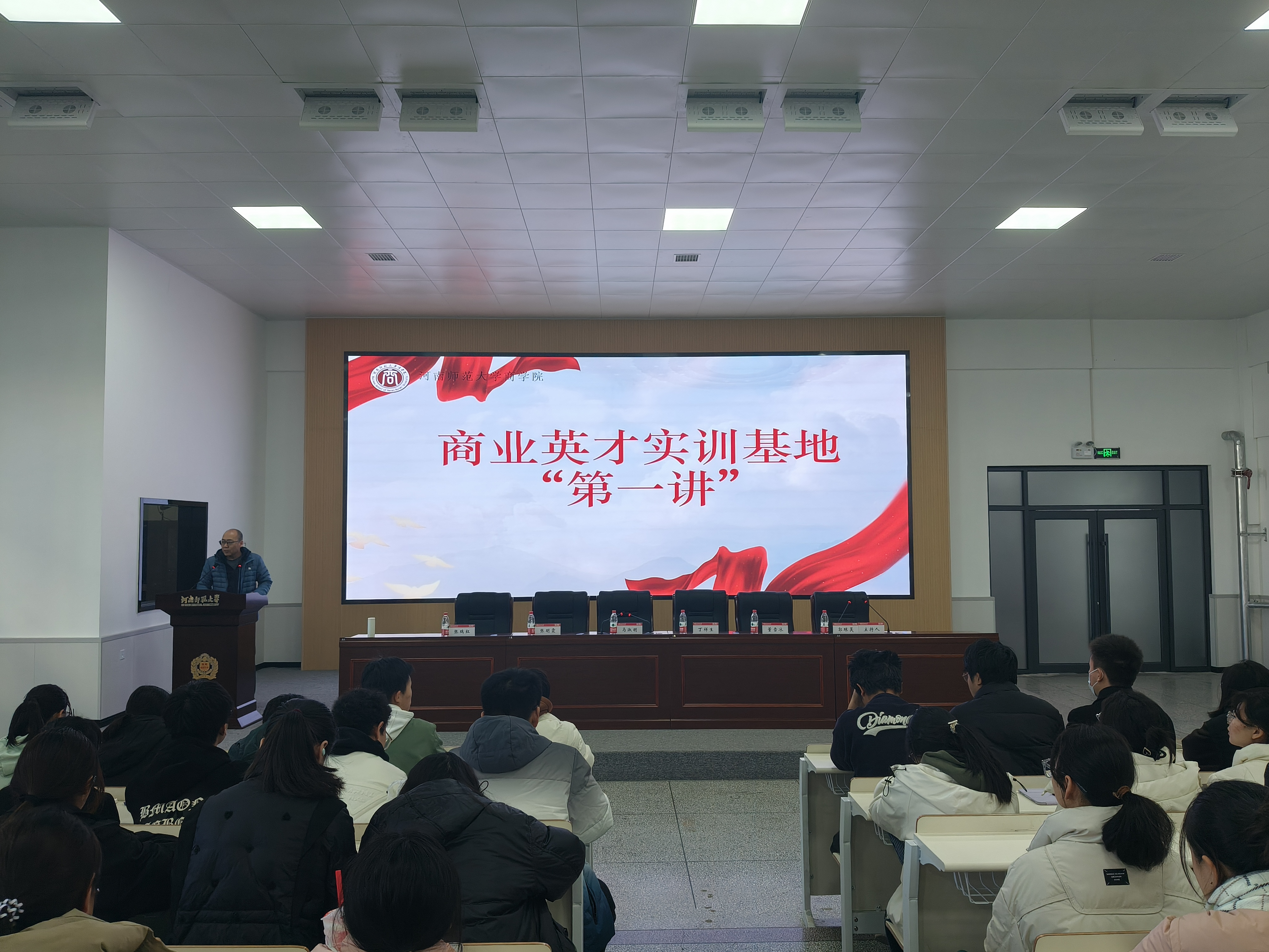 活动伊始,活动负责人温佳佳、学员代表严小龙、社会实践团队代表刘凯隆依次进行发言,从自身经历入手阐述商业实训经验,为同学们创新实践答疑解惑。随后,马淑明发表讲话。她谈到,实训基地建设工作作为学院人才培养方式的深度改革,为学生提供了向外探索、了解社会的窗口。同时,实训基地旨在将实训转化为实战,培养学生主动担当和服务社会的意识,锻炼学生学以致用、创新实干的能力,铺就学生高质量就业的康庄大道。她希望学院师生求真务实、真抓实干,将商业英才实验班打造商学院学科实践特色名片,为社会输送更多高质量人才,为地方经济发展贡献更多高校力量。最后,董雪冰进行“第一讲”授课。他鼓励学生发扬实干精神,锤炼过硬本领,为今后高质量充分就业打下坚实基础,在未来职业道路上昂首阔步前进,实现人生价值。