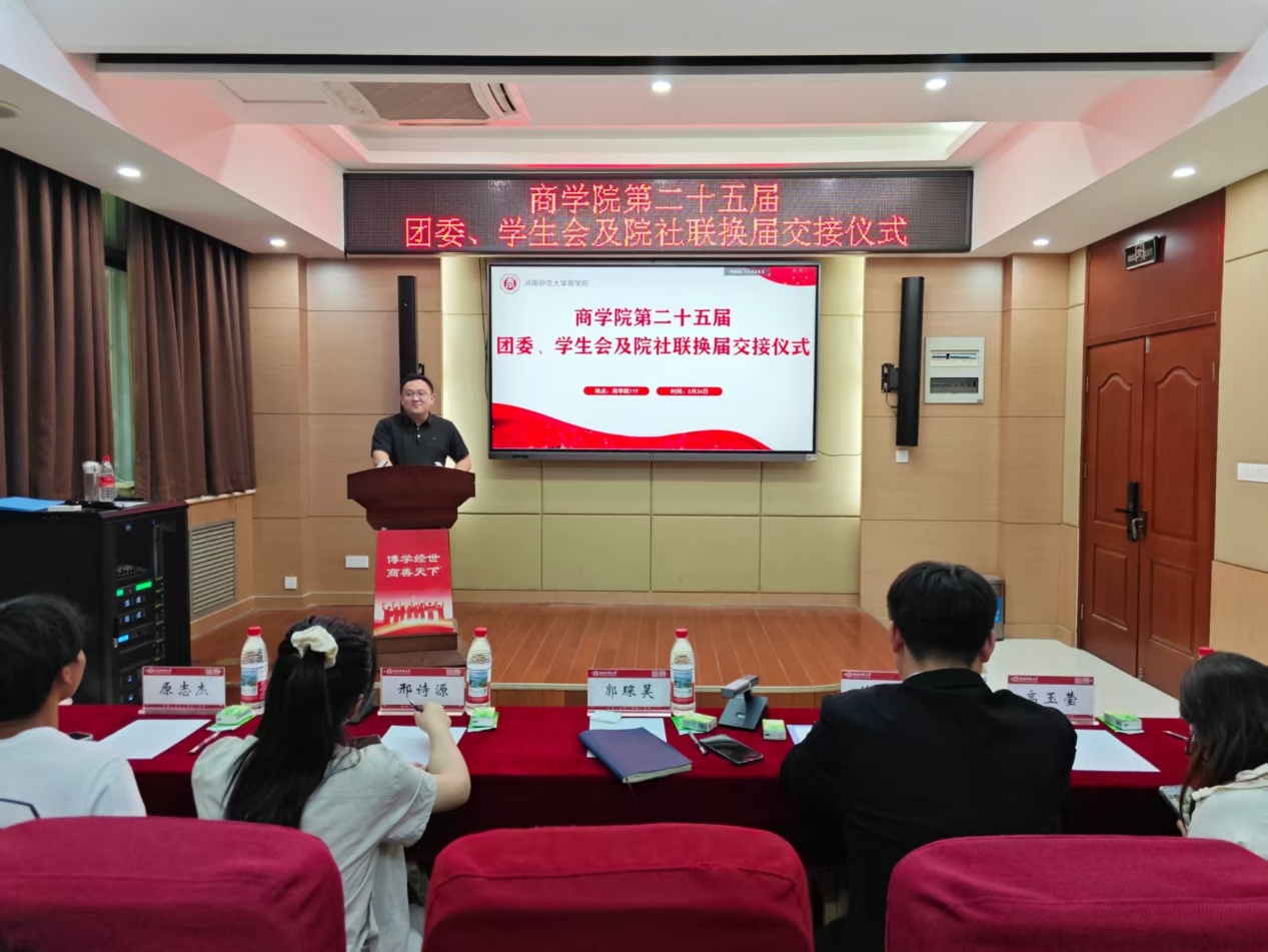 为确保商学院学生工作有序衔接,进一步促进学生干部队伍文化传承与创新发展,5月24日下午,商学院于学院119报告厅举行第二十五届团委、学生会及院社联换届交接仪式。商学院团委副书记郭琛昊,第二十四届与第二十五届团委、学生会及院社联全体成员参会。