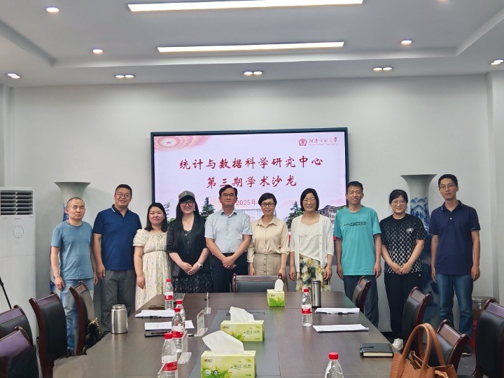 最后,参与学术沙龙的商学院和数学与统计学院的教师一同合影留念。本次学术沙龙活动有效促进了数理统计、经济统计等领域的学术交叉,为我校统计学科发展开辟新的发展路径。