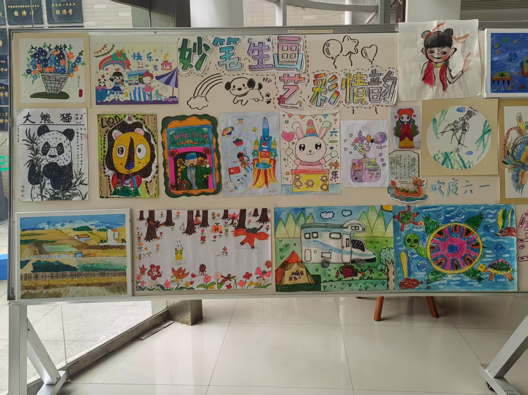 展览现场,一幅幅作品色彩斑斓、创意满满,吸引师生驻足欣赏。绘画作品中,有描绘儿童节欢乐氛围的场景,气球、礼物与笑脸交织,传递纯真喜悦;也有对自然景观的生动勾勒,山川河流、花草树木在孩子们笔下焕发生机。书法作品则笔墨灵动,或古朴典雅、或活泼稚趣,展现出孩子们对传统文化的理解与诠释。