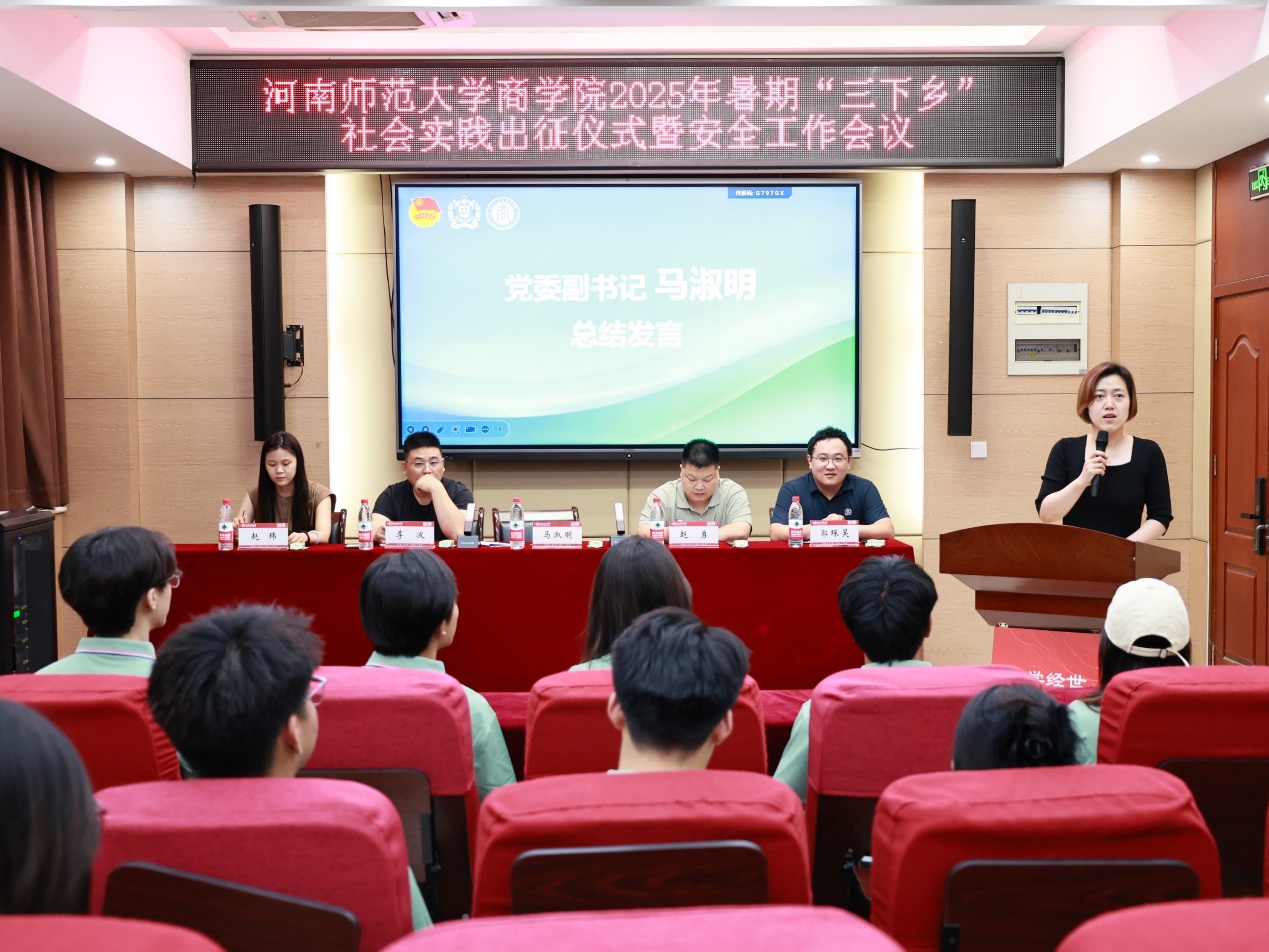 为响应校团委暑期社会实践号召,落实商学院立德树人根本任务,助力青年学生成长成才,7月1日下午,商学院于学院119报告厅举行2025年暑期“三下乡”社会实践出征仪式暨安全工作会议。商学院党委副书记马淑明、团委副书记郭琛昊、各项目指导老师与全体实践团队队员参加会议。