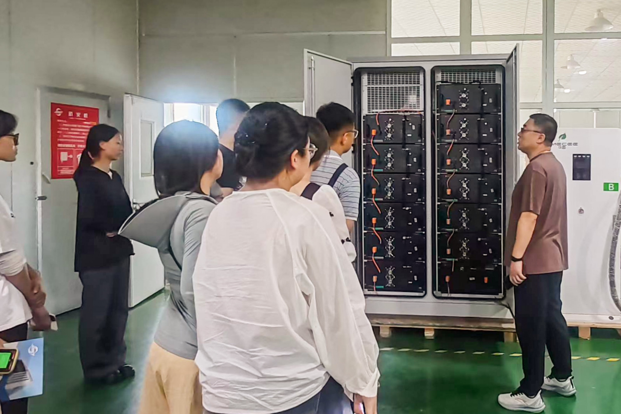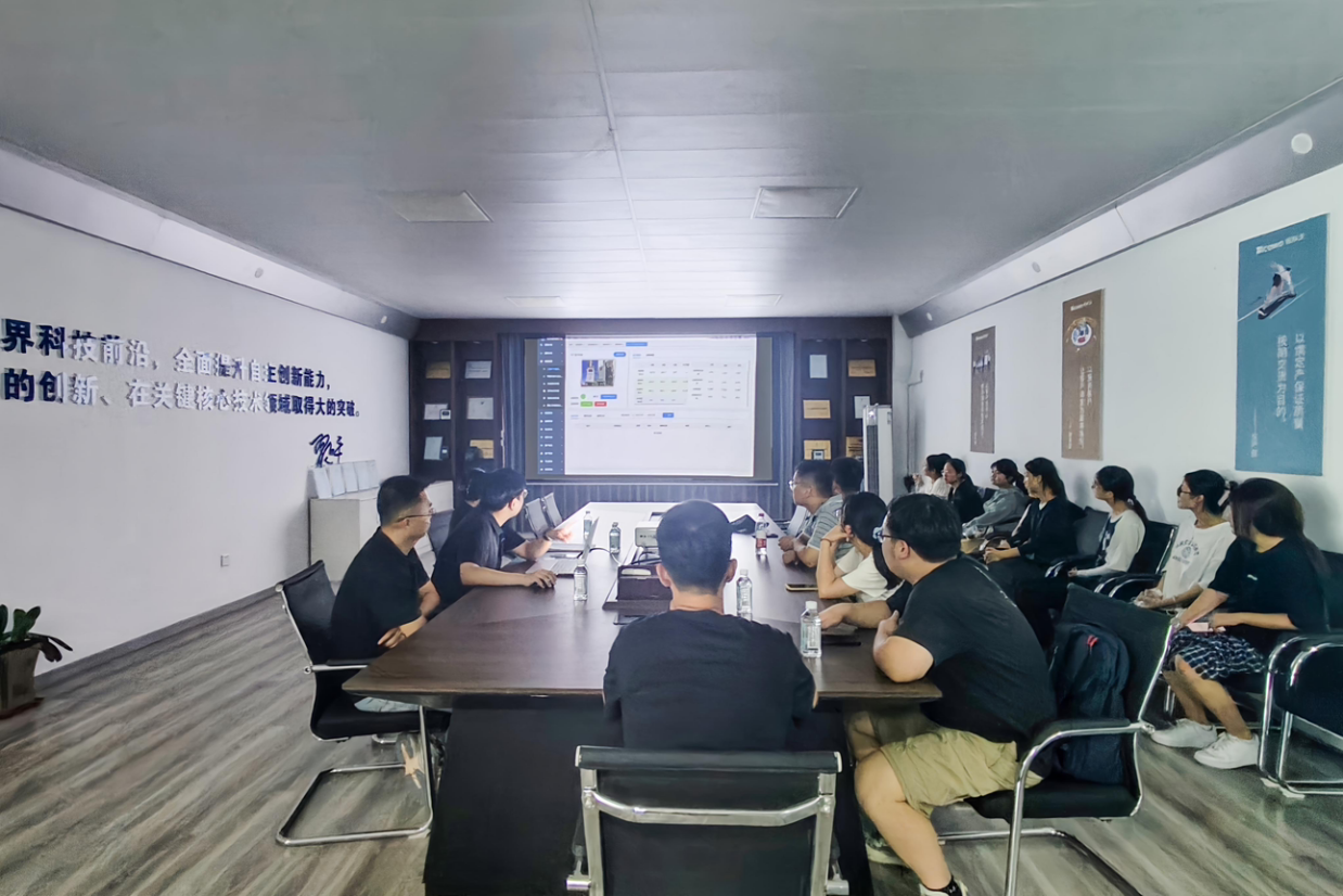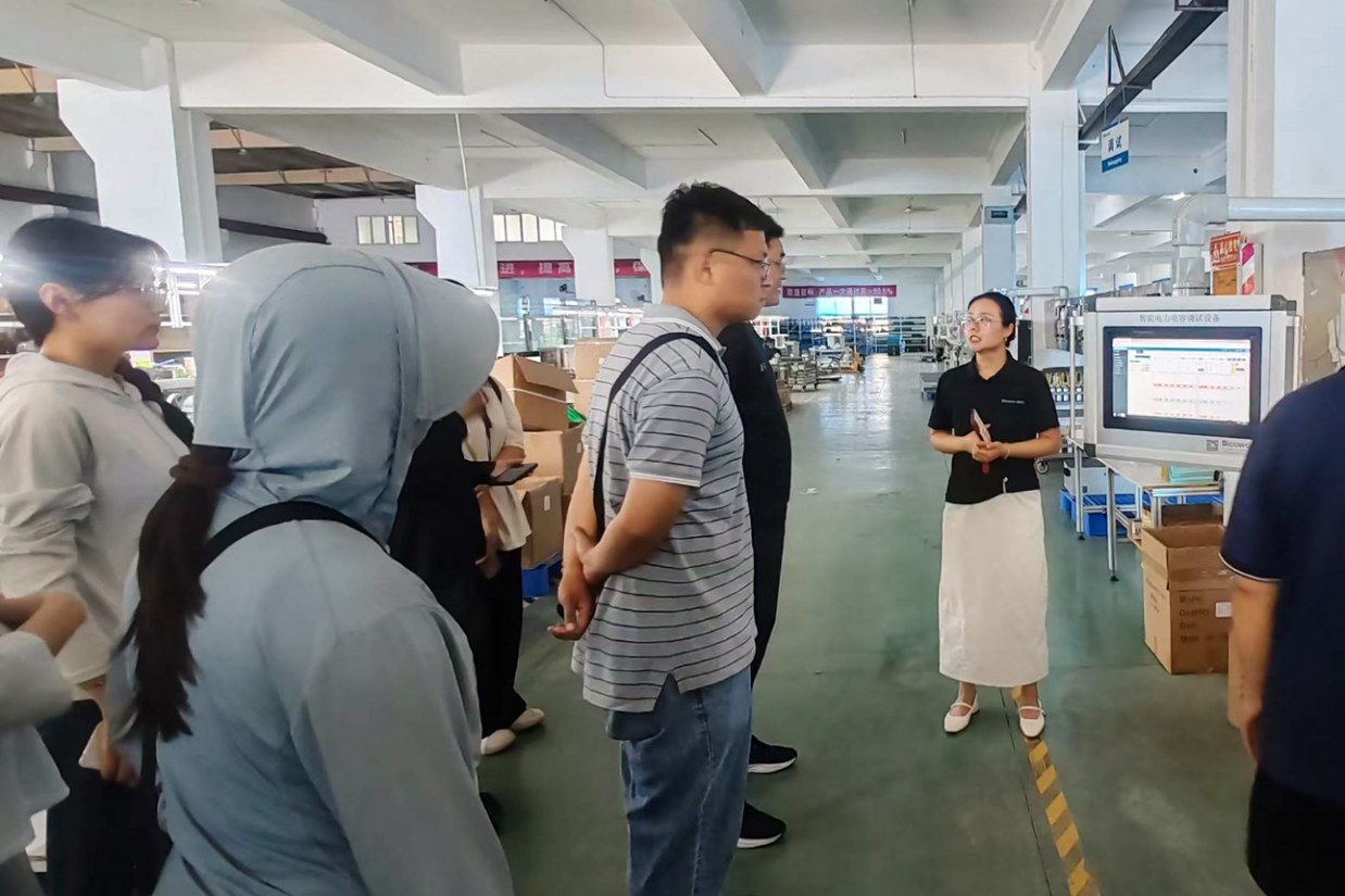 推开展厅大门,调研团成员在企业负责人引导下,沿着“技术脉络—产品矩阵—应用场景”的参观动线展开探索。荣誉墙上,高新技术企业认证与专利证书熠熠生辉;产品陈列区里,智能电容器、4G物联网监测模块等硬件产品有序排列,搭配着PME数字化管理平台的实时演示,勾勒出“硬件研发+软件赋能”的完整生态。随后,团队人员走进智能生产车间,观察物料流转中的二维码系统、仓储扫码系统和能源看板的运转流程,感悟数字化对生产的精准把控。