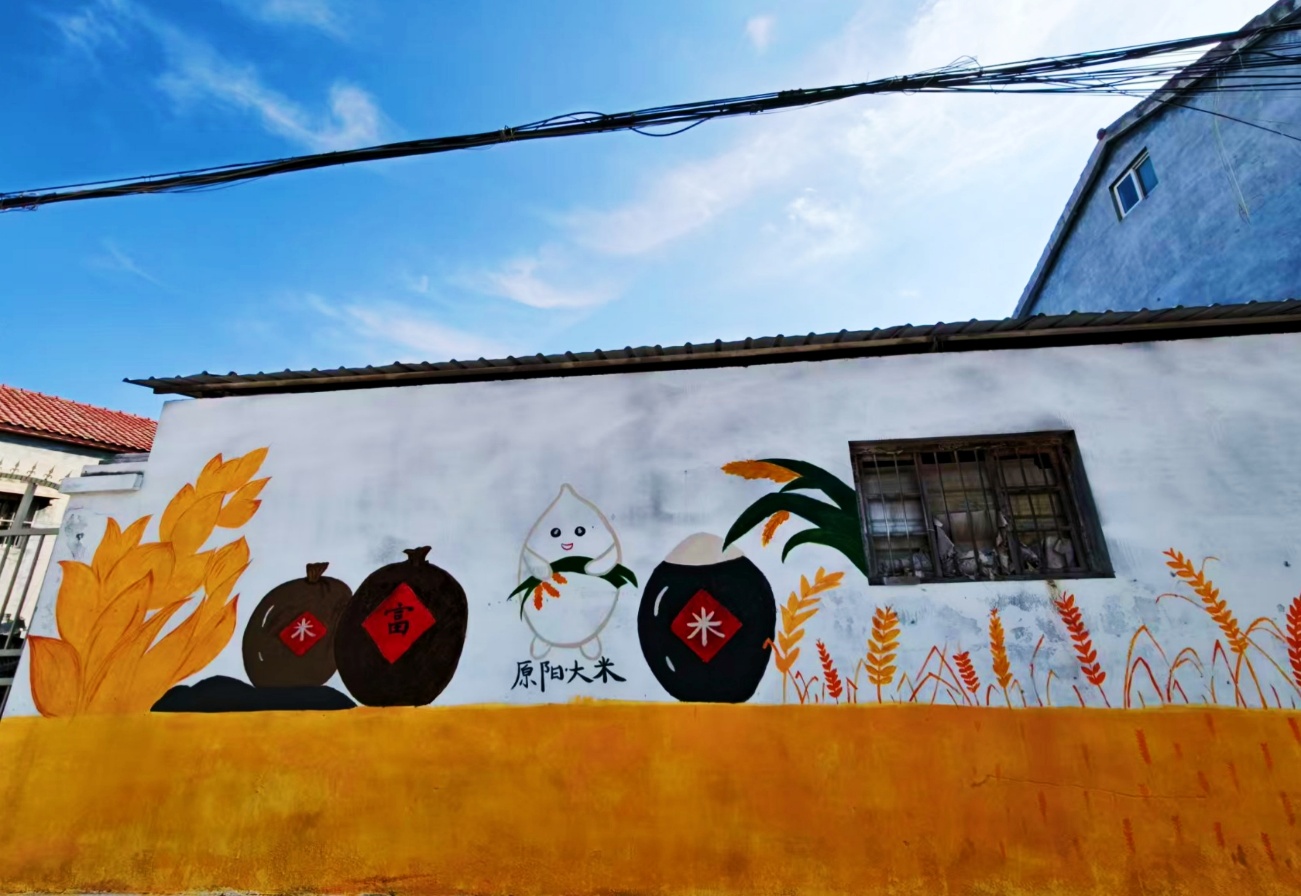 鲜亮的橙红攀上斑驳土墙,金黄的稻穗在砖缝间 “生长”,7月5日,商学院“青春绘影”乡村振兴实践团赴新乡市原阳县阳和乡葛埠口村开展实践调研活动。