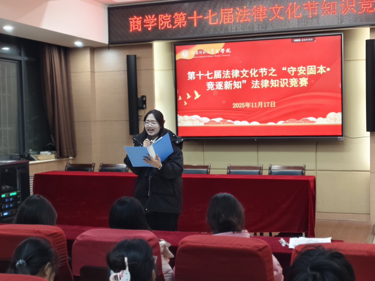 为普及法律知识,提升学生们的法治素养与思辨能力,11月20日晚,商学院于119教室举办第十七届法律文化节之“守安固本,竞逐新知”法律知识竞赛。此次活动面向商学院全体学生开展,同学们积极报名,踊跃参与。