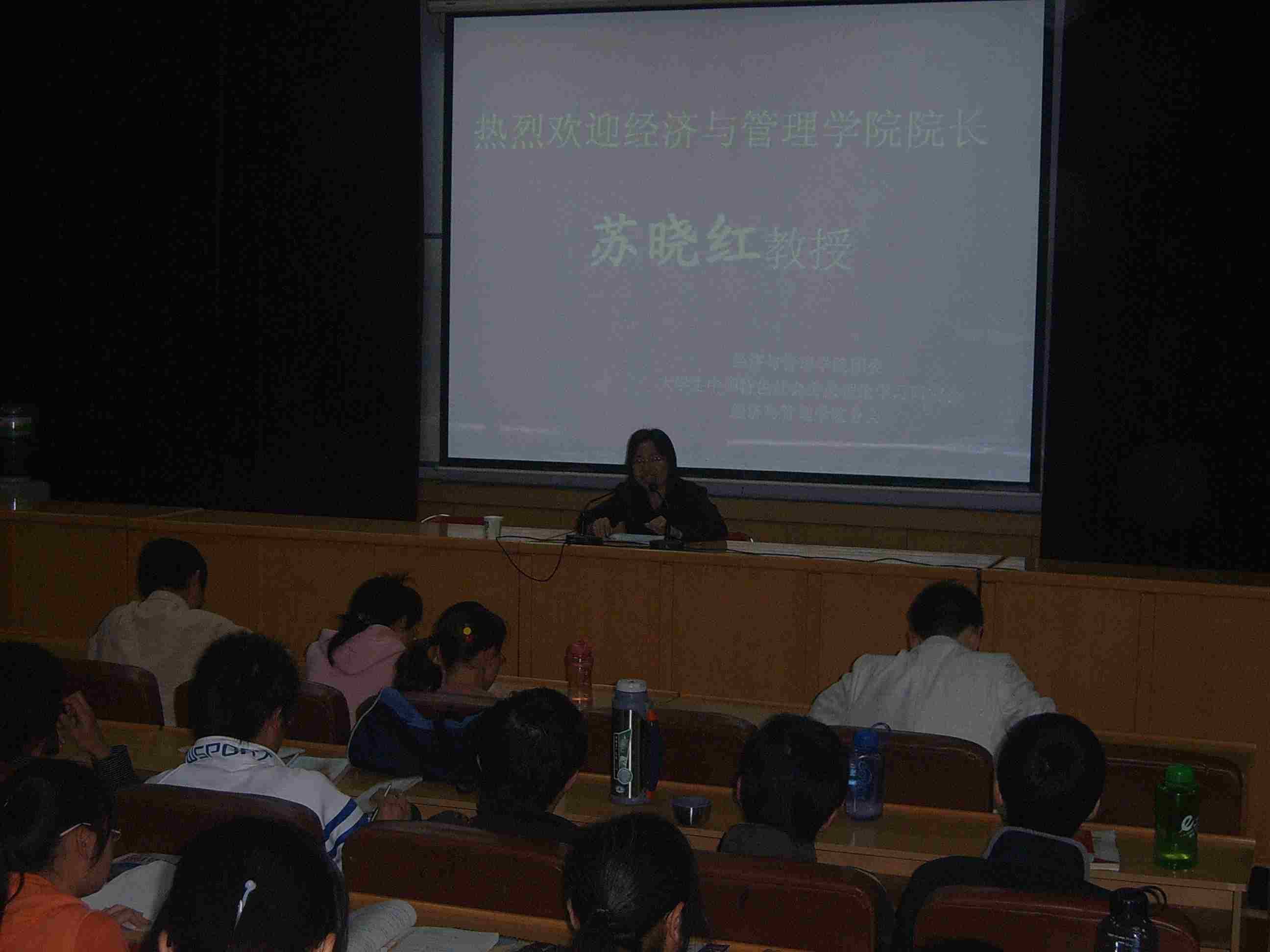 为“纪念改革开放三十周年”帮助同学们深刻理解和把握改革开放的辉煌成就和宝贵经验,培养同学们的爱国热情,坚定 “只有改革开放才能发展中国”的信念,经济与管理学院举行当前我国经济形势报告会。 4月21日上午,经济与管理学院院长苏晓红教授应大学生中国特色社会主义理论学习研究会之邀为来自各个院系共三百余名学生作了题为“改革开放以来我国的通货膨胀及其治理”的报告。报告会在党校教室举行。