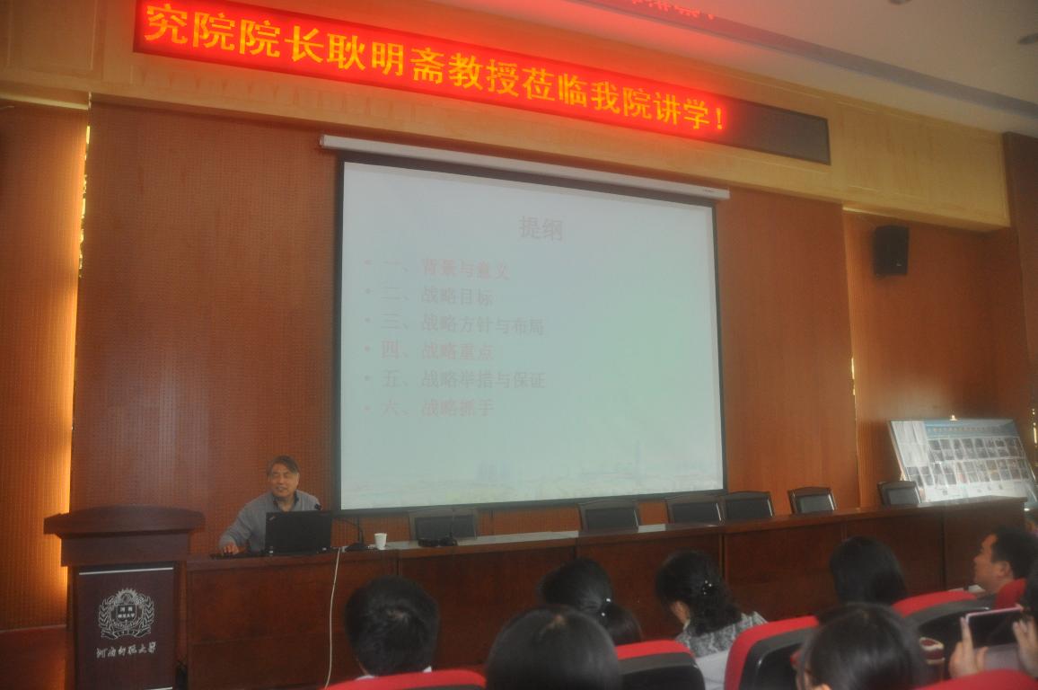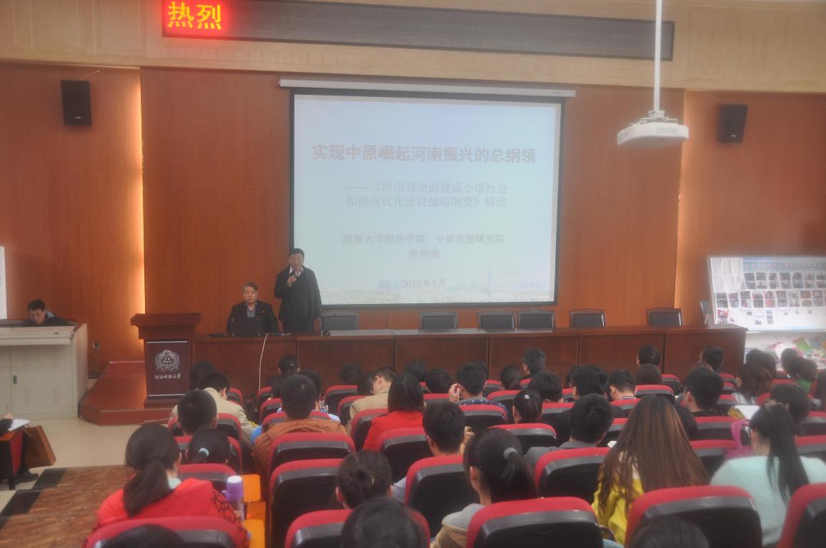 4月22日,应商学院邀请,河南大学经济学院名誉院长、中原发展研究院院长、博士生导师耿明斋教授在东区B楼302教室作了主题为“实现中原崛起河南振兴的总纲领”的报告,商学院骨干教师和学生共300余人聆听了报告,报告由商学院院长任太增教授主持。
