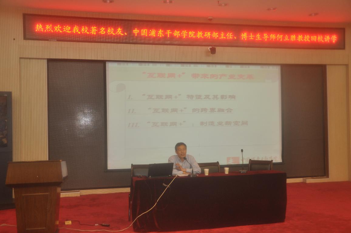 5月22日下午,我校知名校友、中国浦东干部学院教研部主任、博士生导师何立胜教授在我校东区C楼思想政治教育平台作了主题为“‘互联网+’带来的产业变革”的学术报告。学院领导及骨干教师、研究生、本科生共300余人听取了此次报告会,报告会由商院长任太增教授主持。