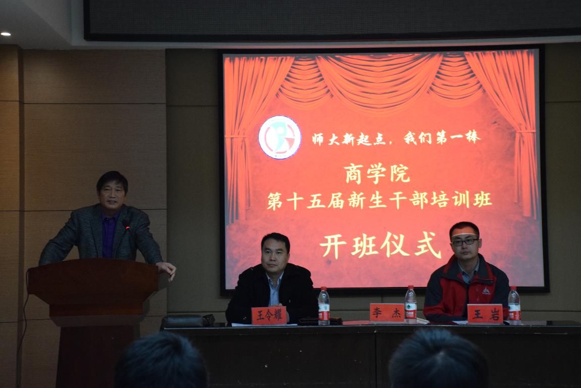 为了加强新生班干部和学生会干事对学生工作的认识,10月30日晚,商学院在商学院一楼会议室隆重举行了“师大新起点,我们第一棒”第十五届团委学生会干事培训开班仪式,院党委副书记李杰、团委书记兼2012级辅导员王令耀、2015级辅导员王岩、2012级学生会优秀干部以及第十五届团委、学生会全体成员出席了此次大会。
