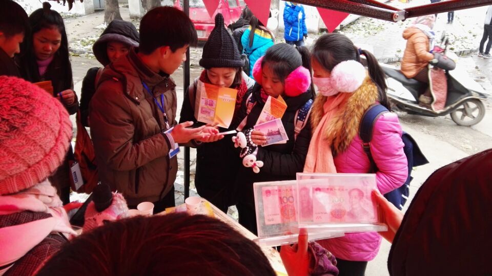 2015年11月12日,我国第五套人民币100元纸币正式发行。而新版人民币与旧版人民币相比,其防伪技术及观赏度有大幅度的提升。为提高人们对新版人民币的认识,增强辨别假币的能力,11月27日中午,商学院团委学生会志愿服务部联合新乡市邮政储蓄银行于我校西区万人餐厅东侧举行“辨新币,拓新知”活动,迎来了不少围观的同学。