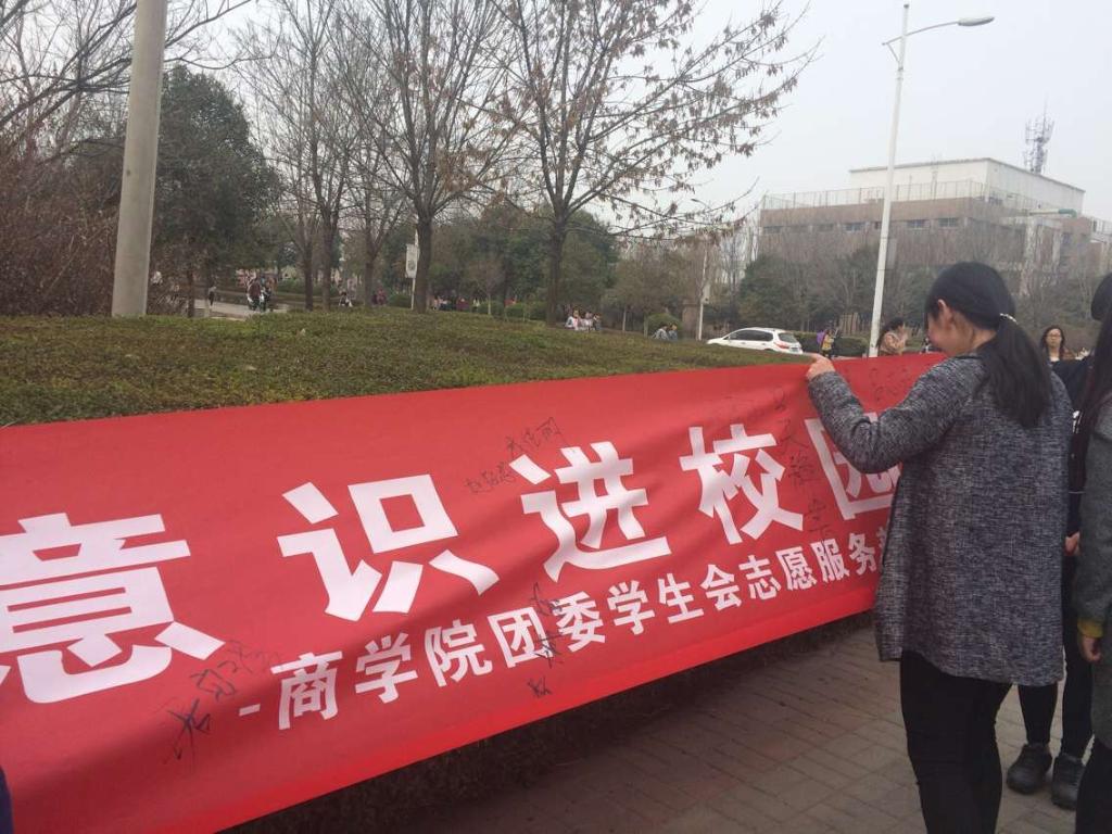 活动前期,商学院团委学生会志愿服务部制定活动标语,安排宣传,做足了充分准备,以确保活动的正常实施和有序进行。活动期间,志愿者们将制作好的横幅摆放在东区餐厅门口,横幅上“和谐消费促发展,维权意识进校园”的口号提醒着大家时刻注意消费安全。活动一开始便吸引了许多同学们驻足观看,并积极踊跃地参与到活动当中,认真有序地在宣传横幅上写下自己的名字,现场人员络绎不绝,也彰显出了同学们的消费素养。随后,志愿者们邀请大家填写有关维护消费者权益知识的调查问卷,以便了解我校学生的维权观念意识。最后,大家一起合影留念,并将签满名字的横幅悬挂起来,时刻提醒同学们重视维护消费者权益,本次活动圆满成功。