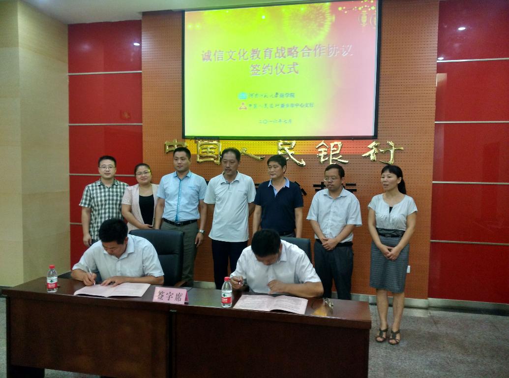 为践行社会主义核心价值观,落实国务院《社会信用体系建设规划纲要(2014-2020年)》的战略部署,加快推进伟德官网下载苹果版商学院信用学科建设,促进信用知识和诚信文化在校园的传播和普及,7月12日,伟德官网下载苹果版商学院与中国人民银行新乡市中心支行举行了签订“诚信文化教育战略合作框架协议”仪式。人行新乡市中心支行党委书记、行长杨存亮,党委委员、副行长张清,征信管理科等相关部门的负责人以及商学院有关负责人参加了签订仪式。