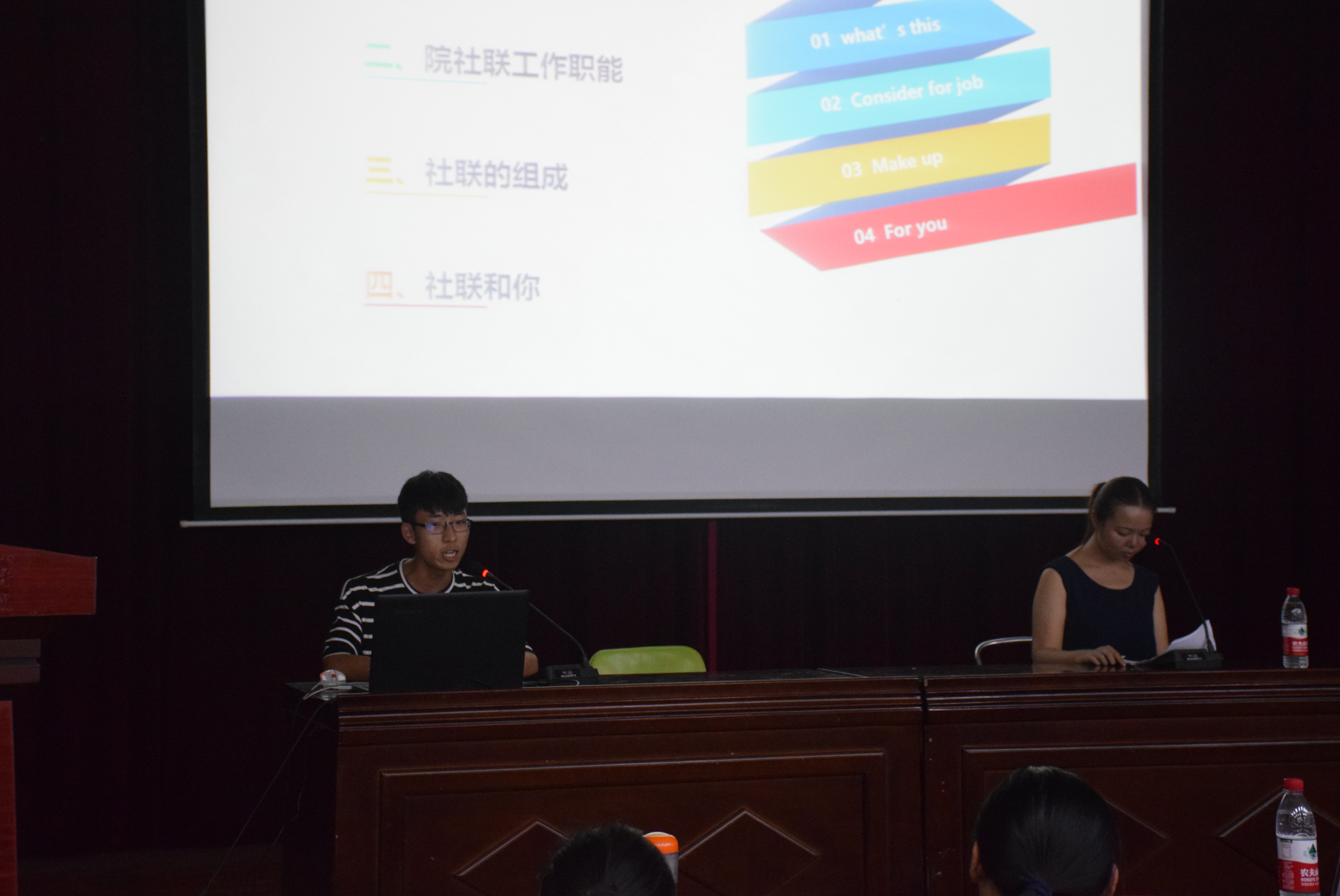 大会在生动有趣的视频中拉开序幕,首先,主持人对应邀嘉宾作了简要介绍。接着,团委学生会21个部口分别对自己的部口进行了精彩的介绍。大会现场掌声不断,热闹非凡,各个部口用精美的PPT以及生动的演说对自己的部口进行宣传。其中体育部帅气幽默的介绍也让新生们对之充满期待,生活部、职业发展服务部更是在本次活动中插入了有奖竞猜环节,现场气氛十分活跃。此外,团委学生会还精心准备了B-BOX、歌曲演唱等精彩表演。在大会的最后,团委书记王岩进行总结,王老师叮嘱同学们一定要对自己有明确的认识和定位,选择适合自己、能够充分发挥个人潜力的部门。同时,王老师还表示,作为干事要把态度放在第一位,不断学习并提高自我,实现在大学期间的全面发展。
