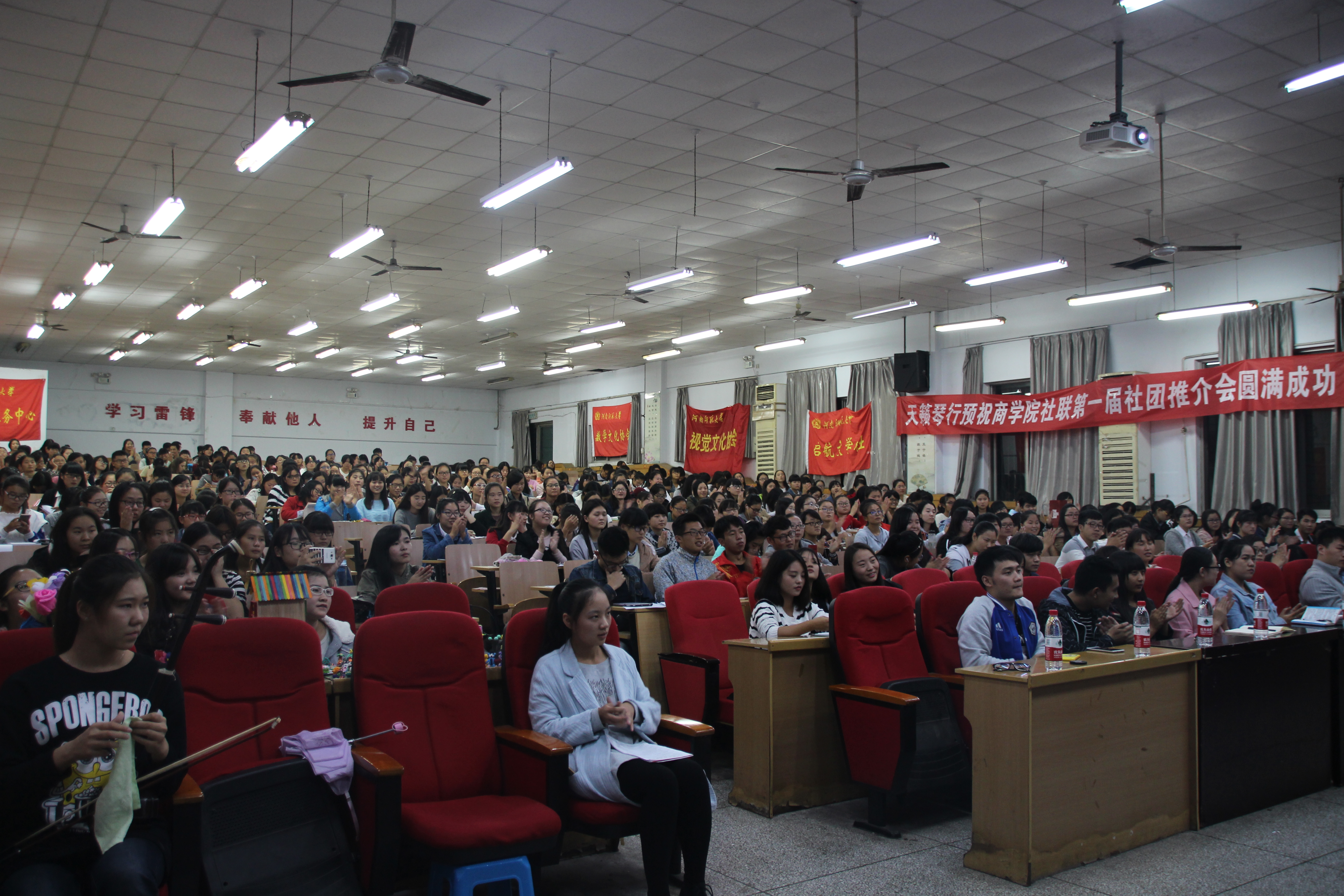 大会在天籁琴行老师的精彩乐器表演中拉开了序幕。接着,商学院市场营销协会、经济贸易协会、数学文化协会、学研会、普天乐足球社五个社团以及教科院幻音B-BOX、童梦圆、心理素质拓展训练营等八个社团依次进行社团简单的介绍。各个社团通过播放PPT和演讲让新生们更清楚的了解到社团性质和与之相关的特色活动。其中,经济贸易协会的特色活动“职来职往”学术与实践相结合,对我院学生把所学专业知识更好地运用到实际当中有很大的帮助,因此也引起了新生们极大的兴趣。幻音B-BOX协会的精彩表演把推介大会推向高潮。同时,介绍人幽默的语言风格赢得了热烈的掌声,现场气氛十分活跃。最后,商学院团委学生会副主席李士成及校社联主席赵梦迪对本次大会进行总结,二人均鼓励新生积极参加自己感兴趣的社团。其中,李士成建议同学们在选择自己感兴趣的社团的同时要注意选报的数量,量力而行。此外,要多加关注对自己专业有关的社团。推介大会在大家热烈的掌声中圆满落下帷幕。