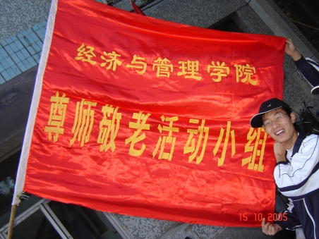 走在师大的校园中,可以醒目的看到那高耸的校训石上镌刻的苍劲有力的八字校训——厚德博学,止于至善,可以看到雄伟的教学楼上那金光闪闪的潇洒题字——学高为师,德高为范,还有那随处可见的宣传栏、标语牌,一字一句,形式多样,不离其旨——“德”“学”并重。正是在“厚德、至善”这样的宗旨的领导下,师大自建校以来,在校内校外开展了形式多样,内容丰富的“以德重教”活动,其中商学院的“尊师敬老”活动开展时间最长,成效最大,影响也最为深远,已独树一帜。