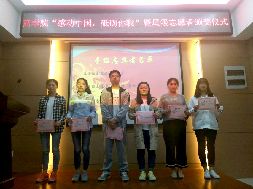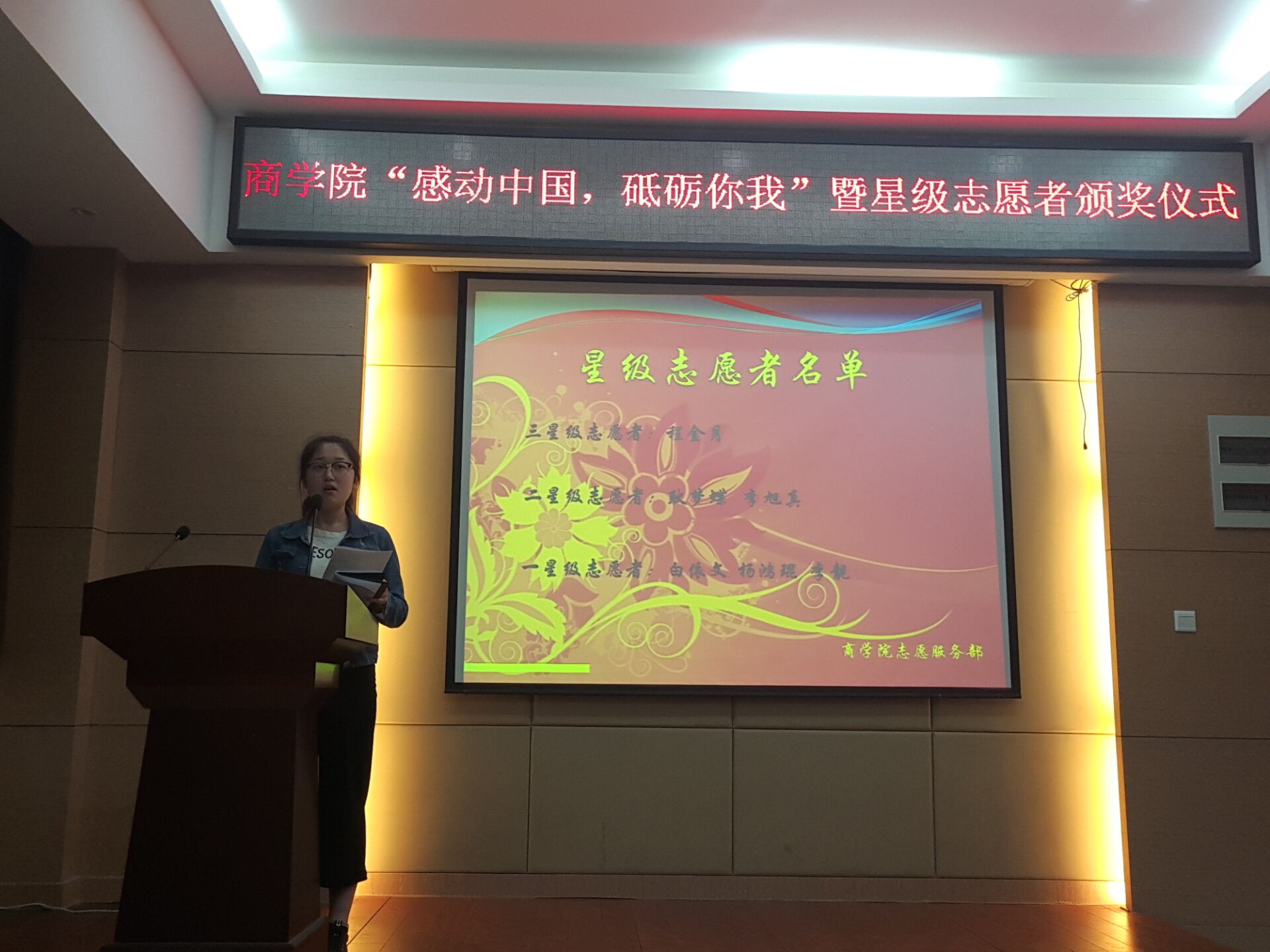 为弘扬民族传统美德,激励学生志愿服务,3月31日晚七时,商学院于商院楼119报告厅举行“感动中国,砥砺你我”学生学习论坛暨星级志愿者颁奖仪式。商学院2017级全体学生干部及部分学生参加了此次活动。