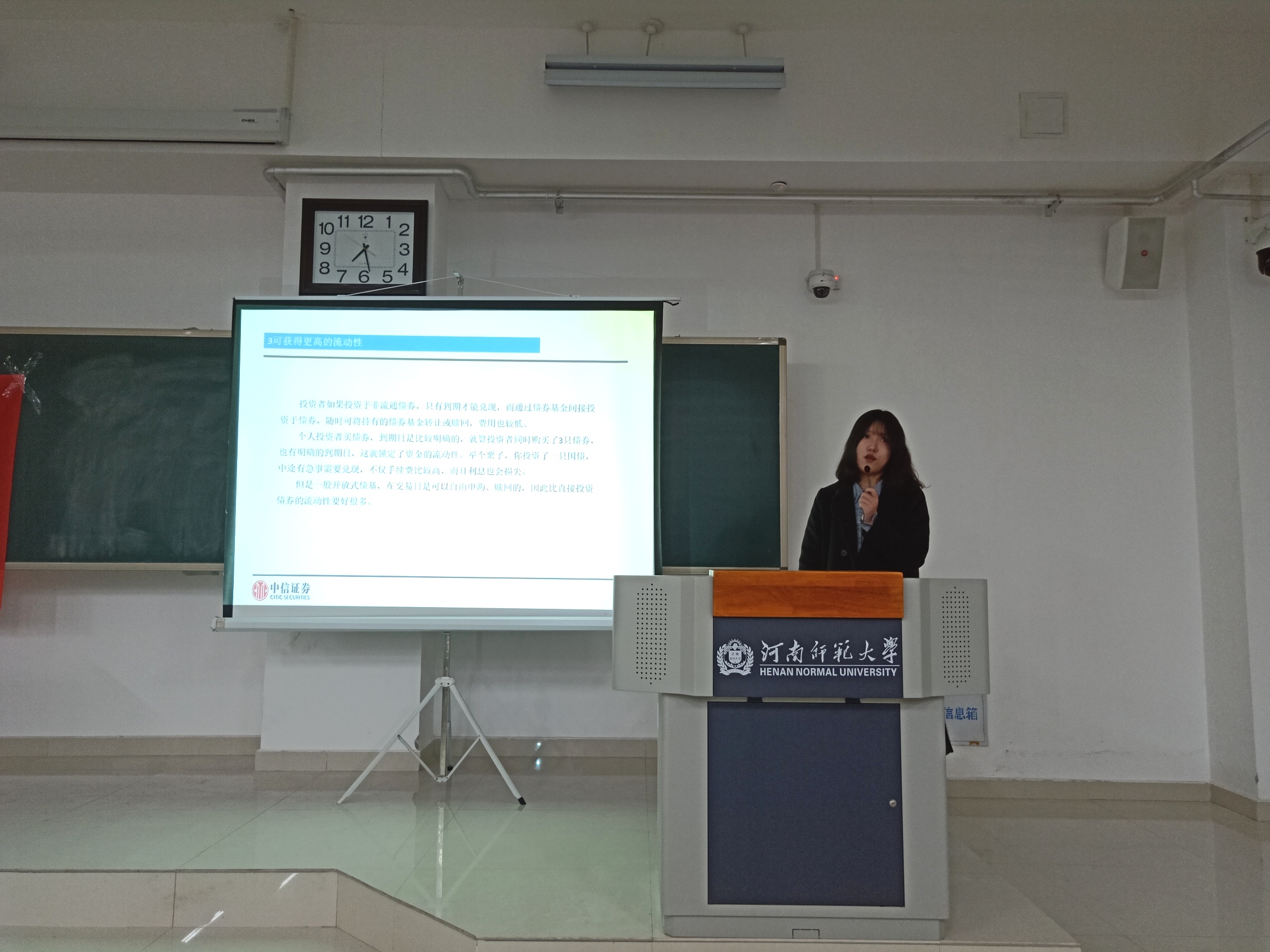 为帮助同学们解决在模拟炒股大赛中遇到的问题,12月15日晚,商学院经济贸易协会联合中信证券公司新乡营业部,在东区综合教学楼104教室开展“信享杯”模拟炒股大赛之理财课堂讲座。中信证券公司新乡营业部高级客户经理李雪、苏路路等应邀出席本次活动并担任主讲人。商学院相关负责人和模拟炒股大赛参赛者参加了本次活动。