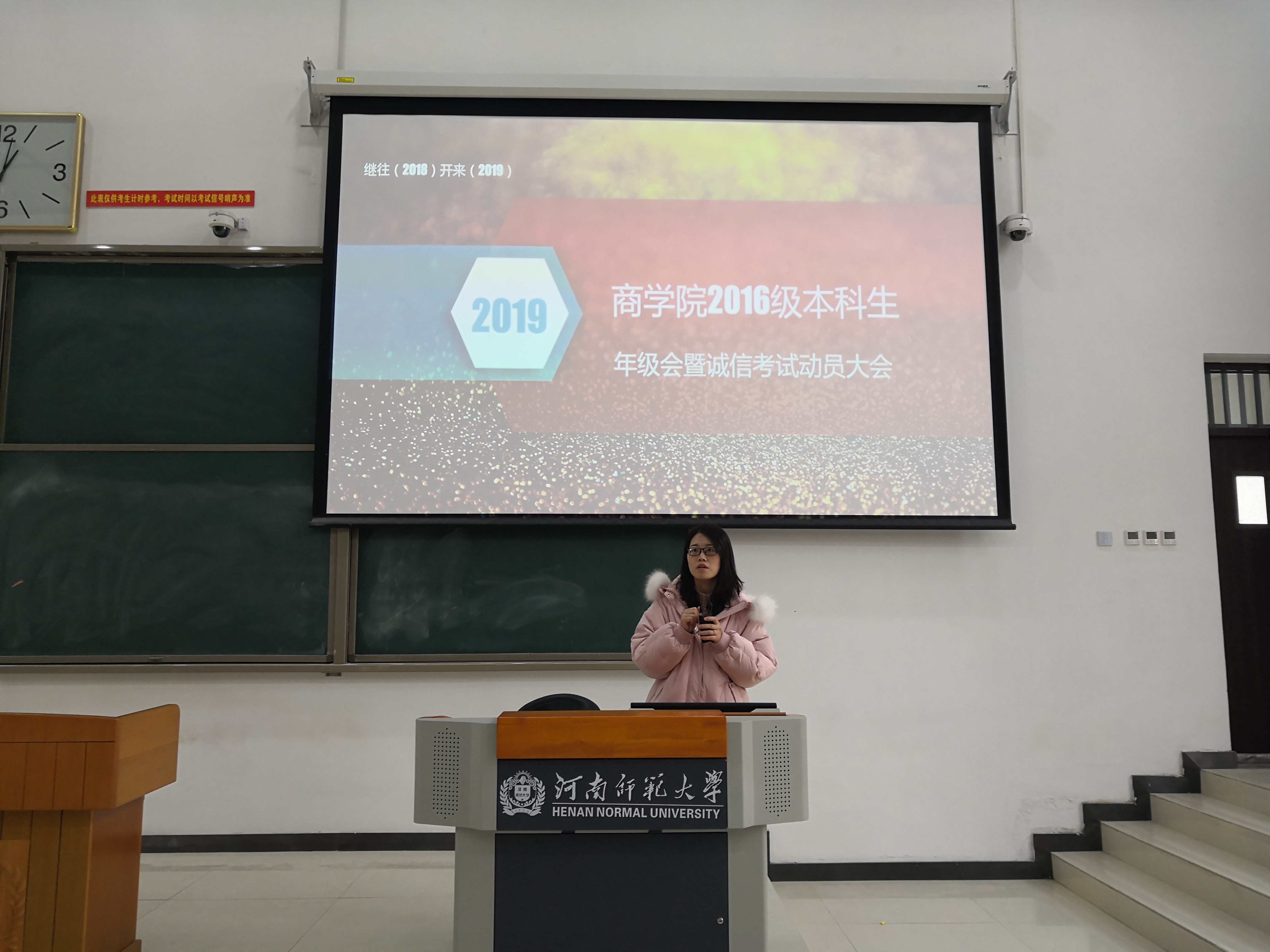 为加强年级学风建设、严肃年级考纪,帮助同学们明确近阶段年级考研工作进展、树立假期安全意识,商学院2016级于1月8日中午一点在东区综合楼127召开了“年级会暨诚信考试动员大会”。会议持续一个小时,商学院2016级辅导员郑园园主持了本次会议,兼职辅导员秦一丹、兼职辅导员王悦及2016级全体同学到场聆听。
