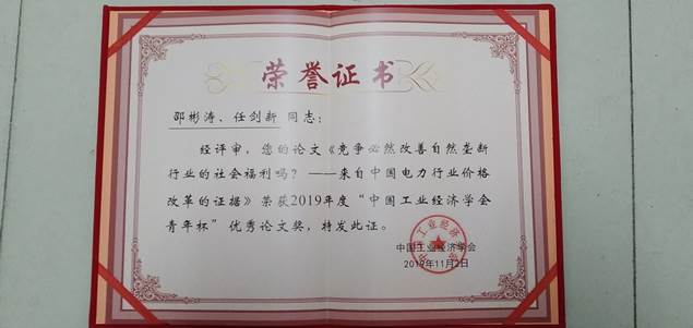 首届“中国工业经济学会青年杯”优秀论文奖获奖证书