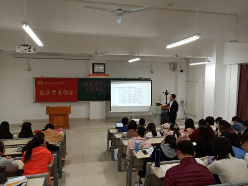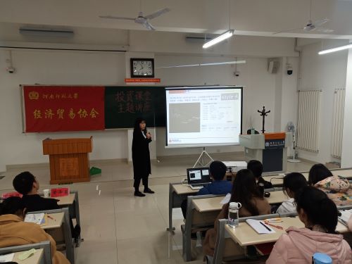 11月23日晚七时,商学院社团联合会及经济贸易协会联合中信证券新乡营业部于东区综合楼403教室举办第二届“信享杯”模拟炒股大赛之《投资课堂》主题讲座。中信证券新乡营业部区域总监黄泽勇、高级理财顾问苏路路应邀出席并担任主讲人,商学院相关负责人和模拟炒股大赛参赛人员到场聆听学习。