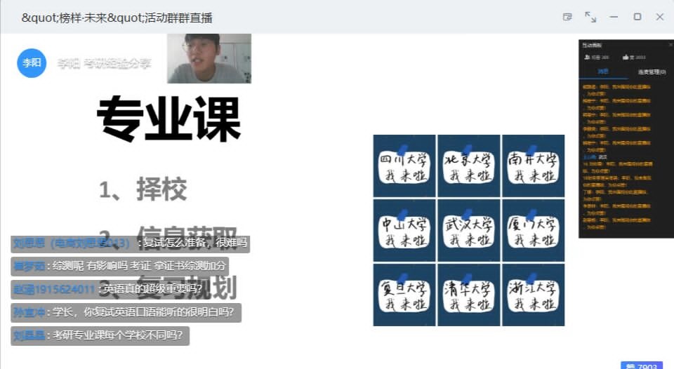 “研”途修筑梦想,经验拨开迷茫。考研、就业经验分享会上,2016级优秀学生代表们分别分享了自己在求学路上如何确定人生目标、如何科学规划学习任务、专业课学习、学习方法以及专业方向的选择和复试等方面的注意事项,并就学生个人最关心的问题进行了现场答疑,取得了较好效果。活动期间气氛活跃,同学们纷纷表示:活动干货满满,受益匪浅,会以榜样为引航,努力实现心中的梦想。