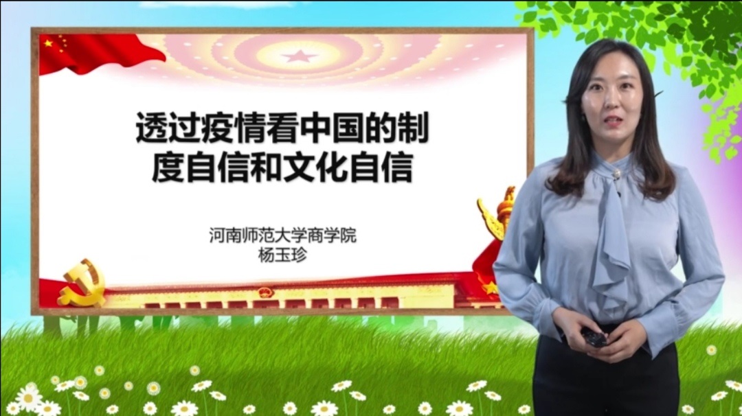 “透过疫情看中国的制度自信和文化自信”线上战疫主题讲座上,河南省青年讲师团成员、商学院副院长杨玉珍教授紧扣广大人民群众坚决打赢疫情防控阻击战的鲜活素材,将中国与世界各国的防疫举措对比,深入解读了中国的制度优势和文化自信。“一个时代有一个时代的任务,一代人有一代人的长征路”,作为新一代青年,杨院长希望全体同学能够以青春之名,践行习近平总书记对青年“坚定理想信念,站稳人民立场,练就过硬本领,投身强国伟业”的期许。