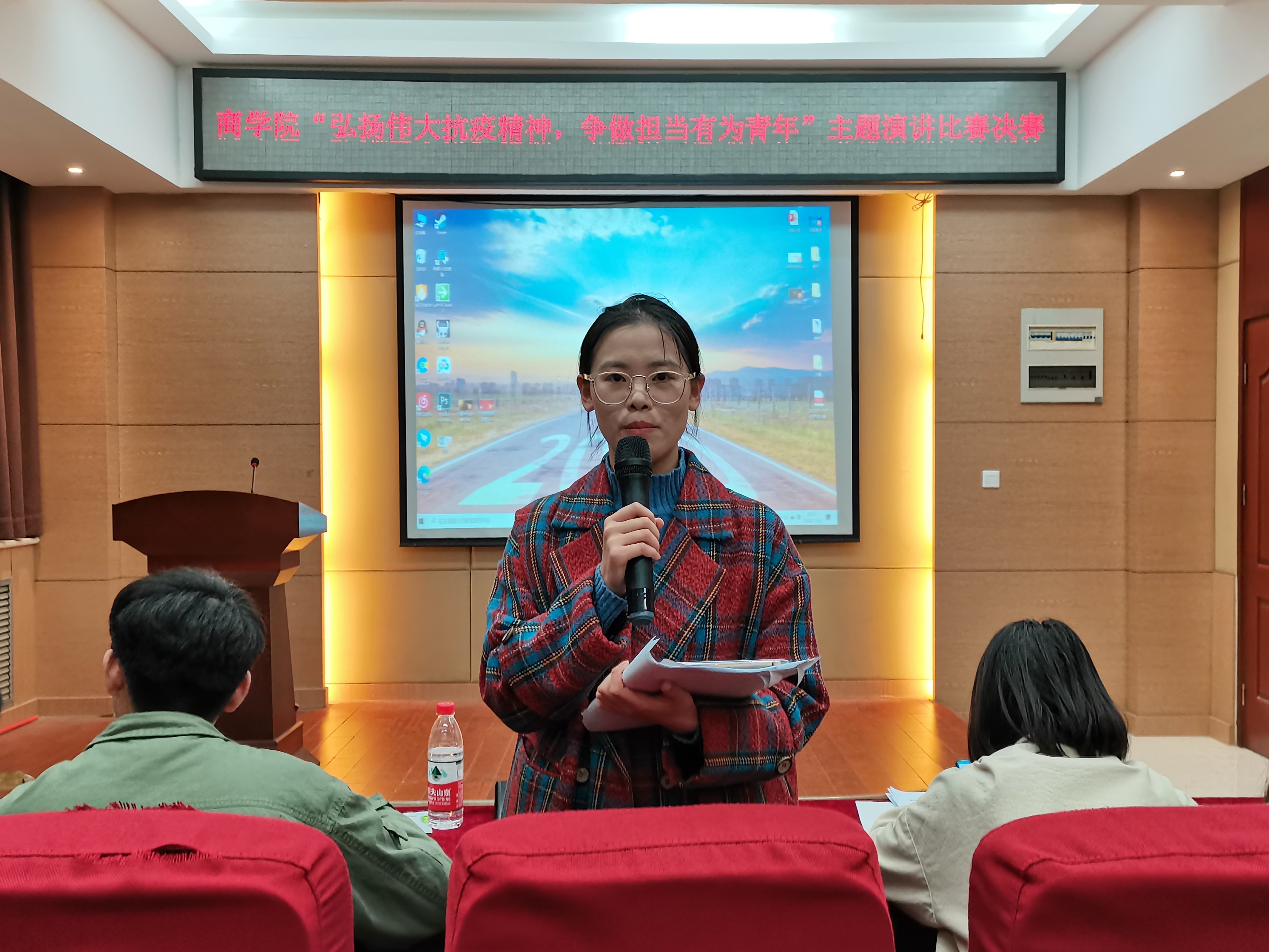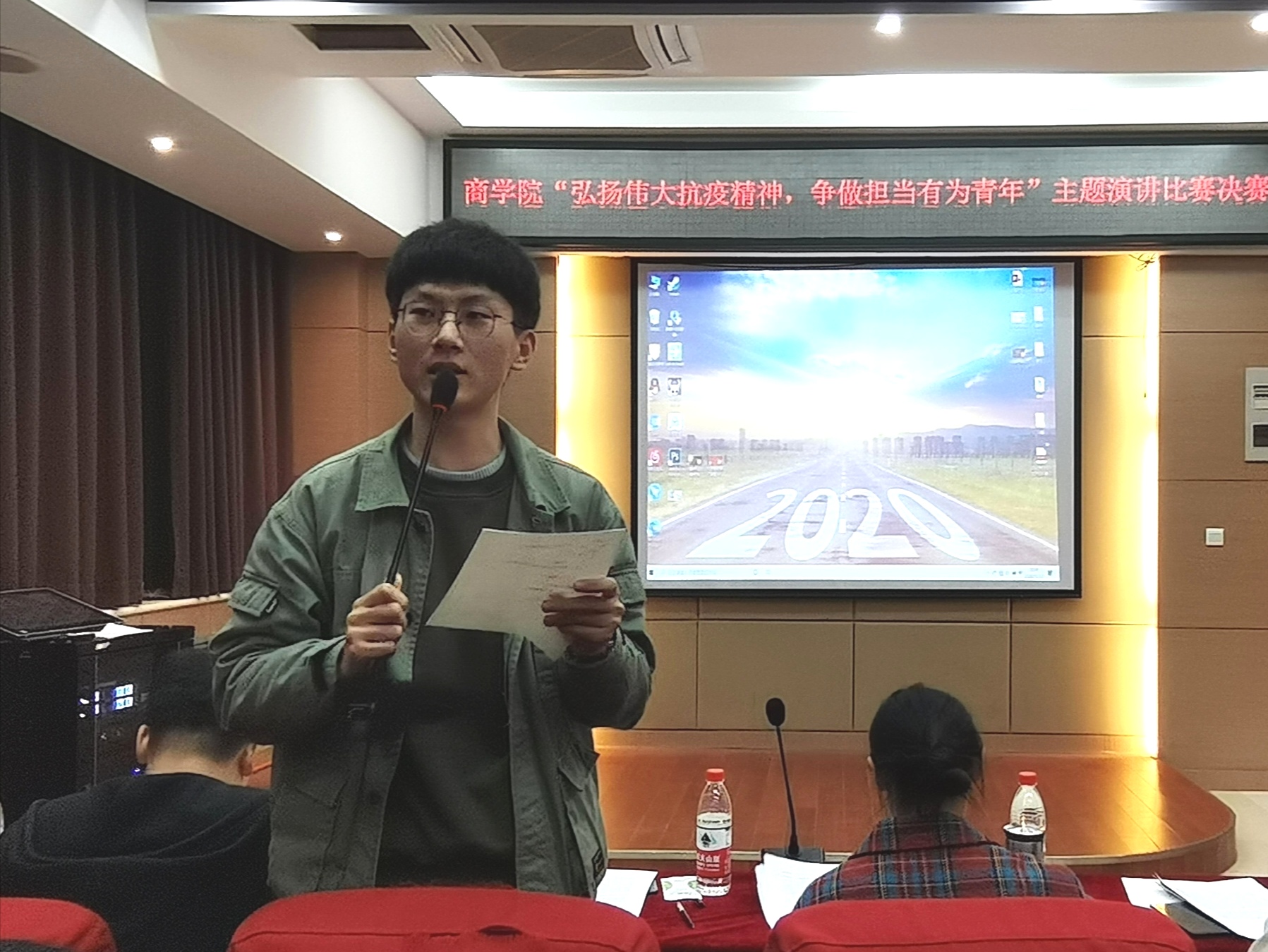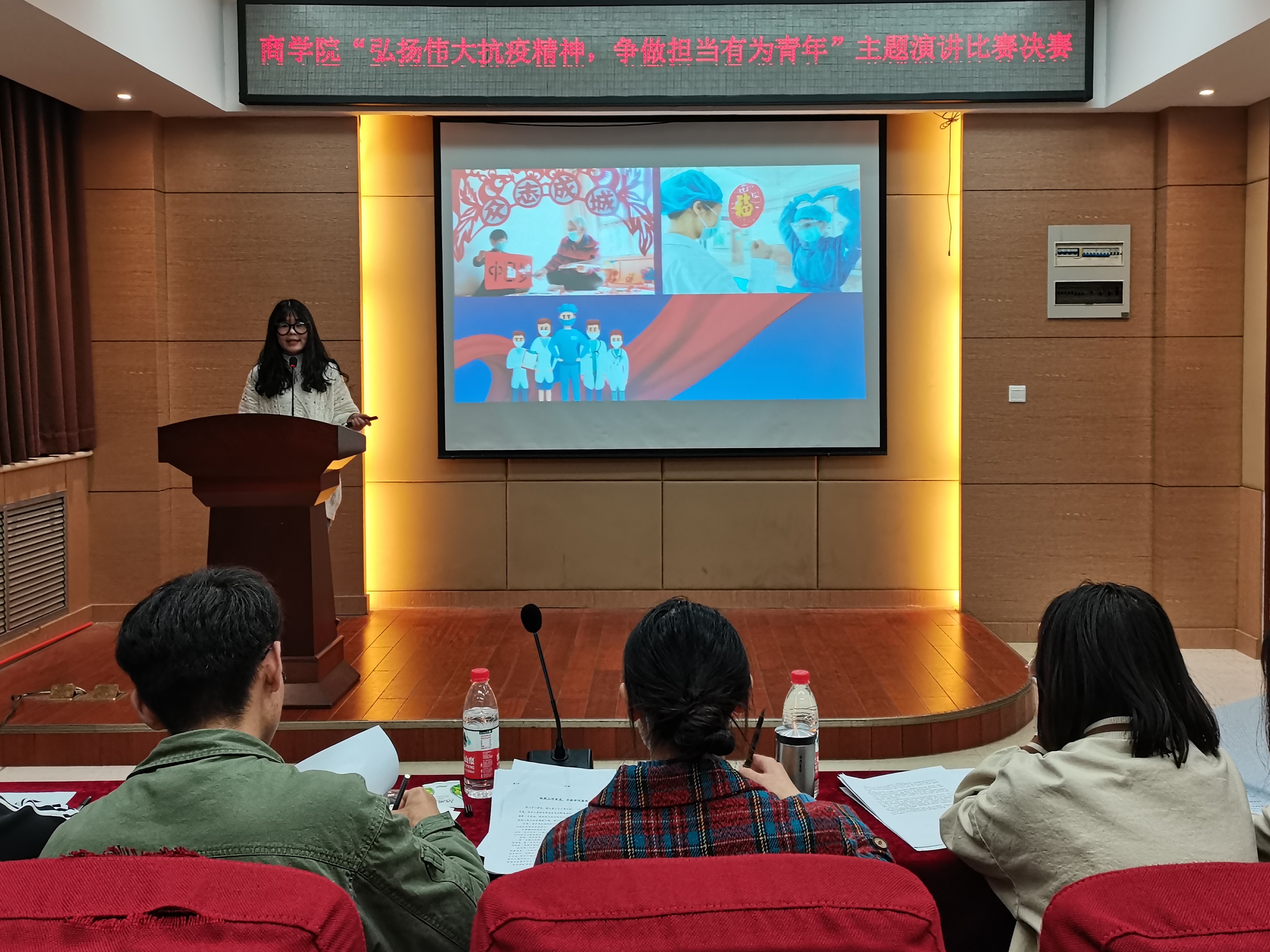 上下同心,则无往不胜。为致敬抗疫英雄,感悟奉献精神和英雄气概,11月12日晚,商学院于119会议室举行了以“弘扬伟大抗疫精神,争做担当有为青年”为主题的演讲比赛。文学院黄一哲同学、商学院郭帅同学及相关负责人出席本次活动并担任评委。