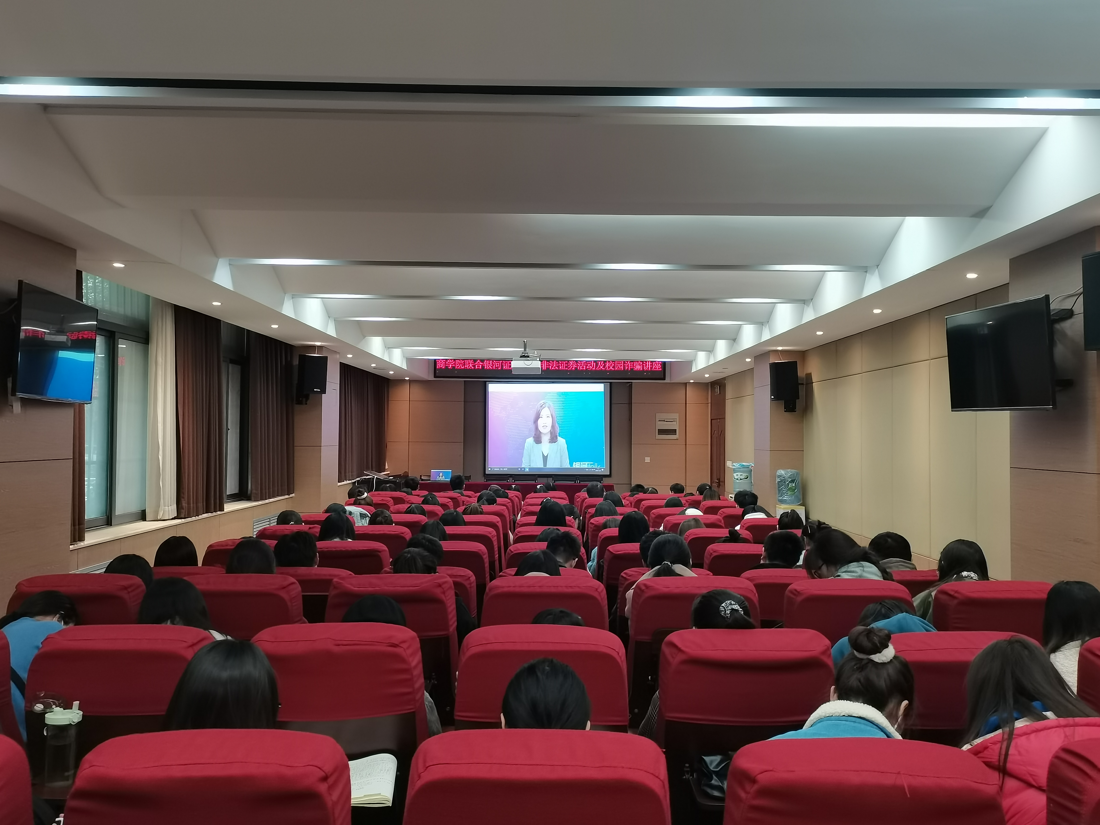 为帮助学生提高安全意识、金融素养与防诈骗能力,11月20日下午,商学院联合中国银河证券股份有限公司,在学院楼119报告厅举行防范非法证券活动及校园诈骗直播讲座。银河证券法律合规总部李晓丽担任主讲。百余名学生到场观看。