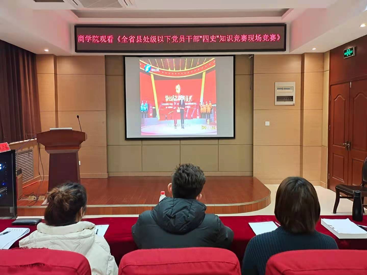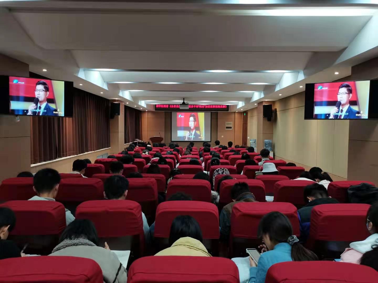为深入贯彻学习习近平新时代中国特色社会主义思想,进一步提升党员干部理论素养和党性修养,12月9日晚,商学院于学院楼119报告厅举行了《铭记历史、走向复兴—全省县处级以下党员干部“四史”知识竞赛现场竞赛》观看活动。商学院2018级辅导员聂广森应邀出席,部分党员及2020级全体学生干部到场观看。