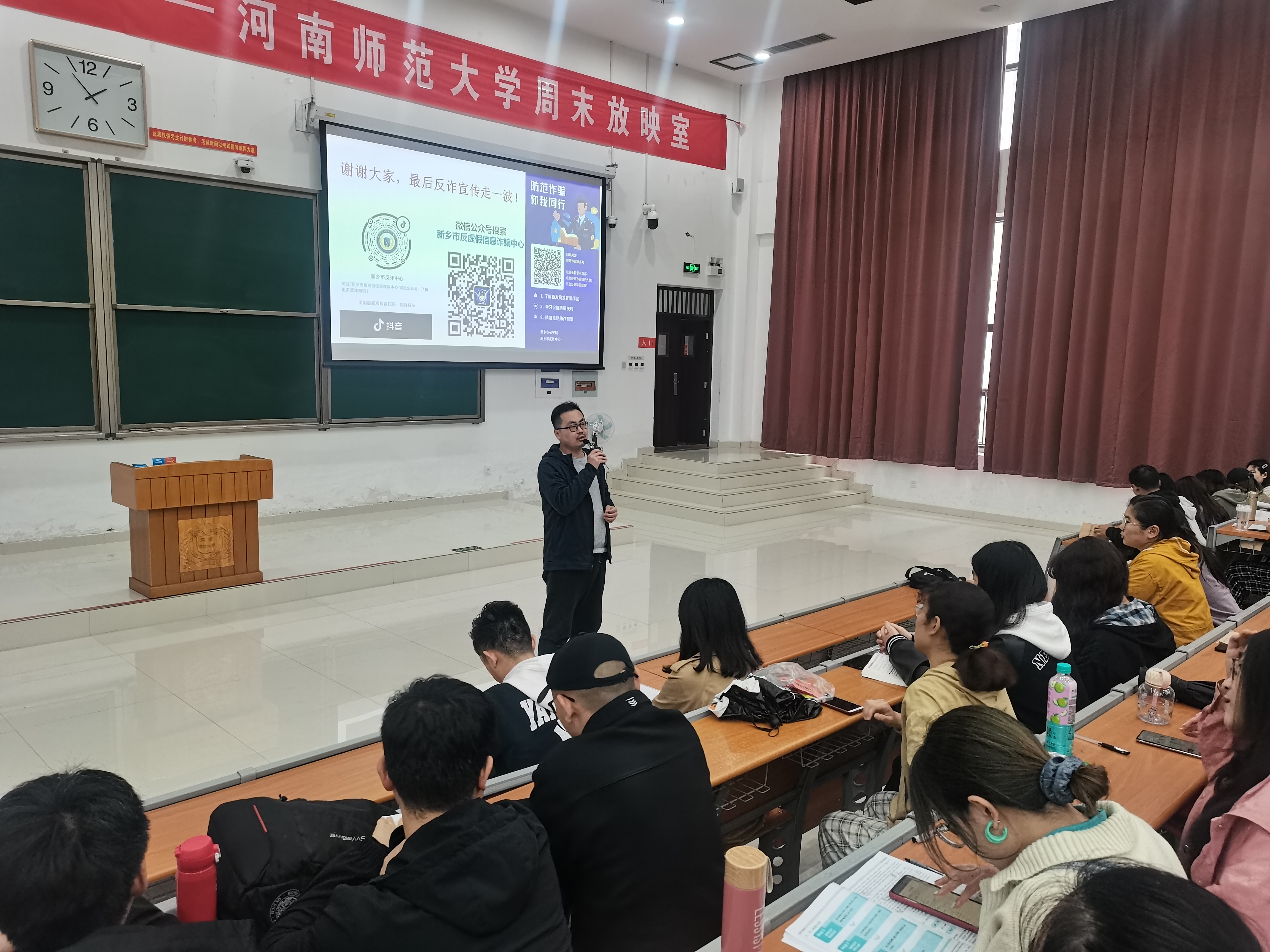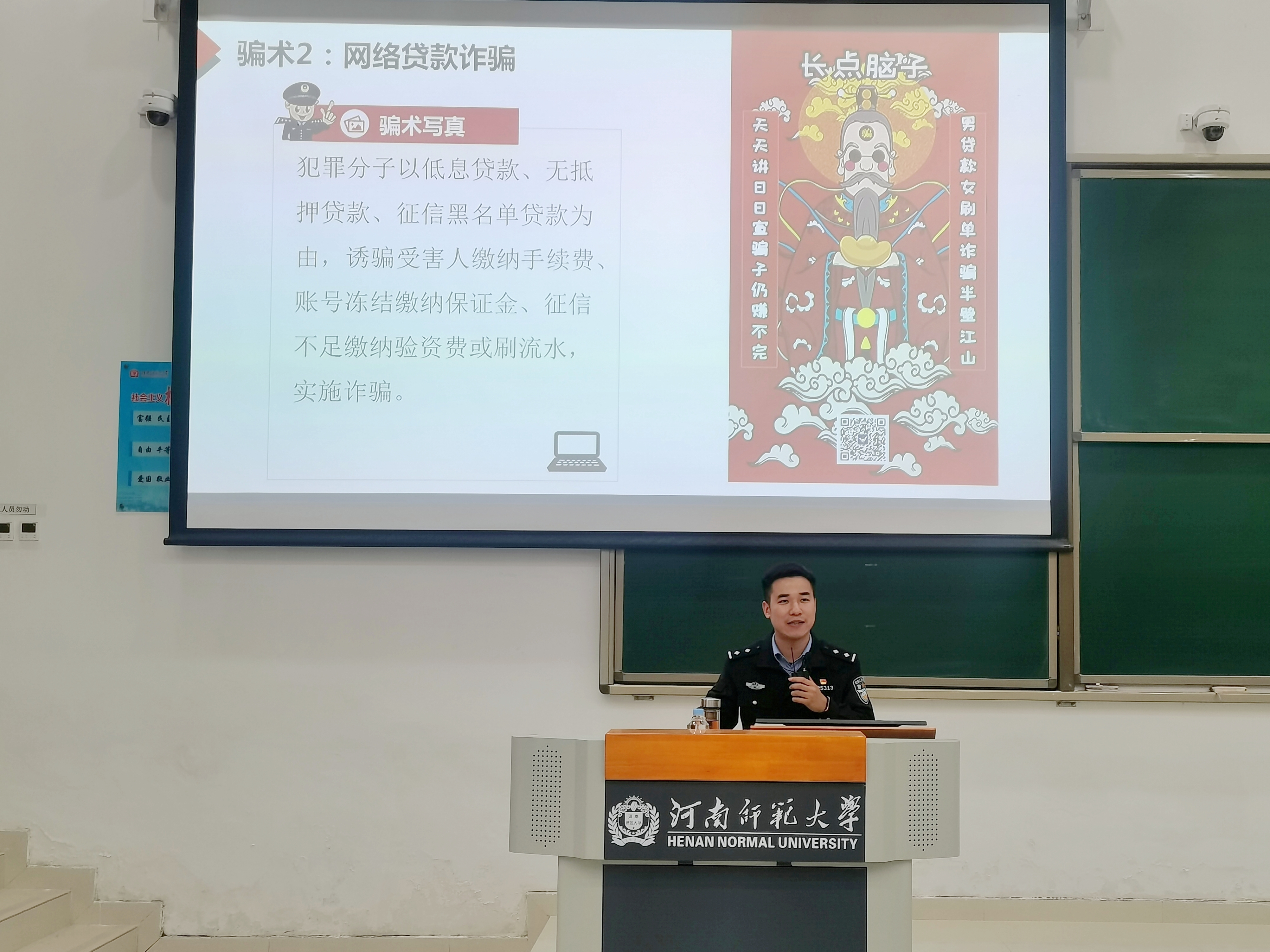 为深入贯彻落实习近平总书记对打击治理电信网络诈骗犯罪工作作出的重要指示,提升学生对网络诈骗的自我防范意识,4月21日中午,商学院在文昌楼102教室举办了防范电信网络诈骗知识讲座。新乡市公安局电信网络犯罪侦查支队警长张阳担任此次讲座的主讲人,商学院相关负责人应邀出席,各年级寝室长、生活委员到场聆听。