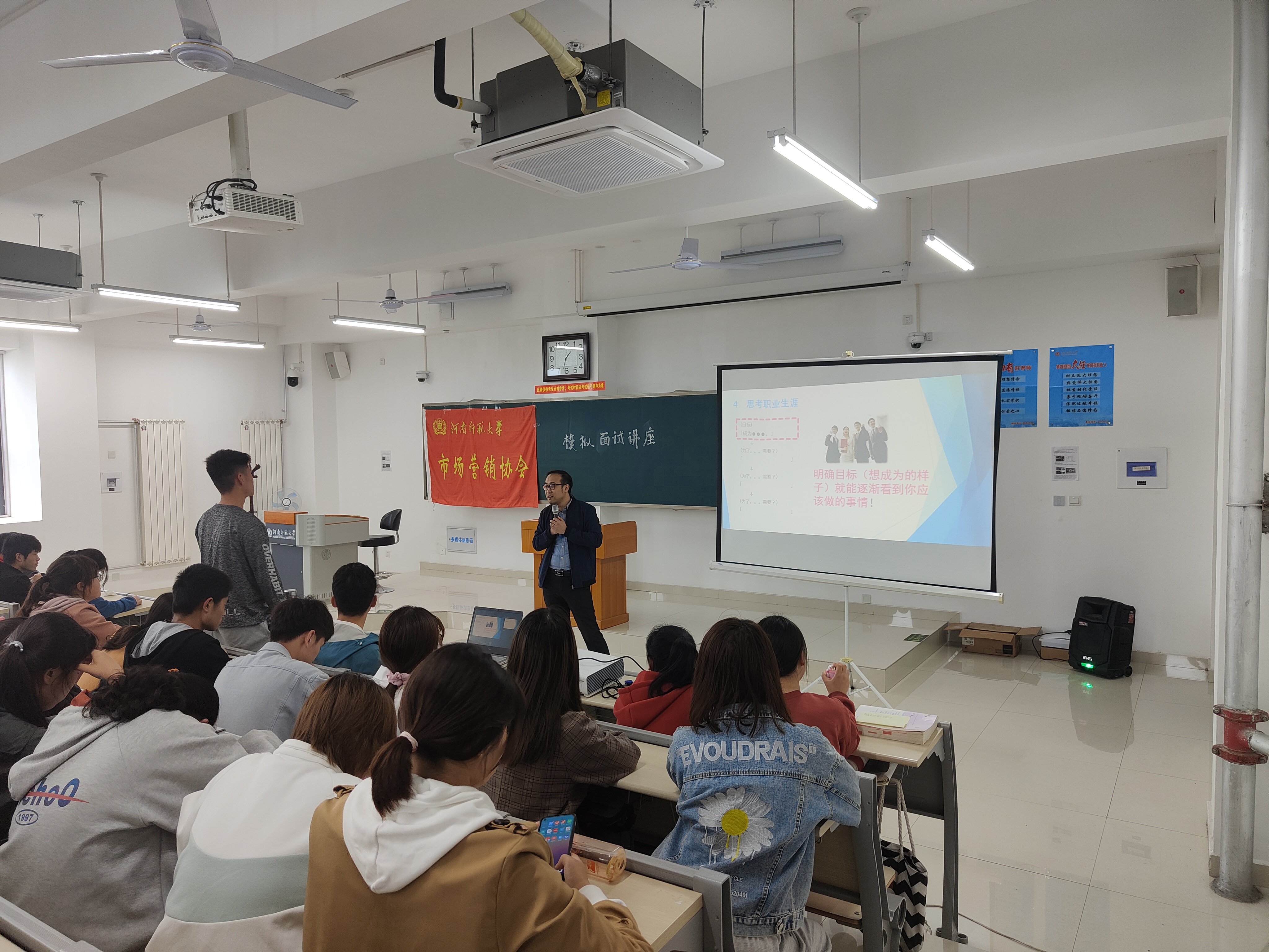 为提高大学生未来求职的竞争力,给学生提供一个近距离接触招聘平台的机会,帮助学生全方位了解应聘相关知识技巧,4月24日中午,商学院市场营销协会于文昌楼428教室举办模拟面试讲座活动。本次讲座主讲人为学院市场营销教研室教师侯宏伟。百余名学生到场聆听学习。