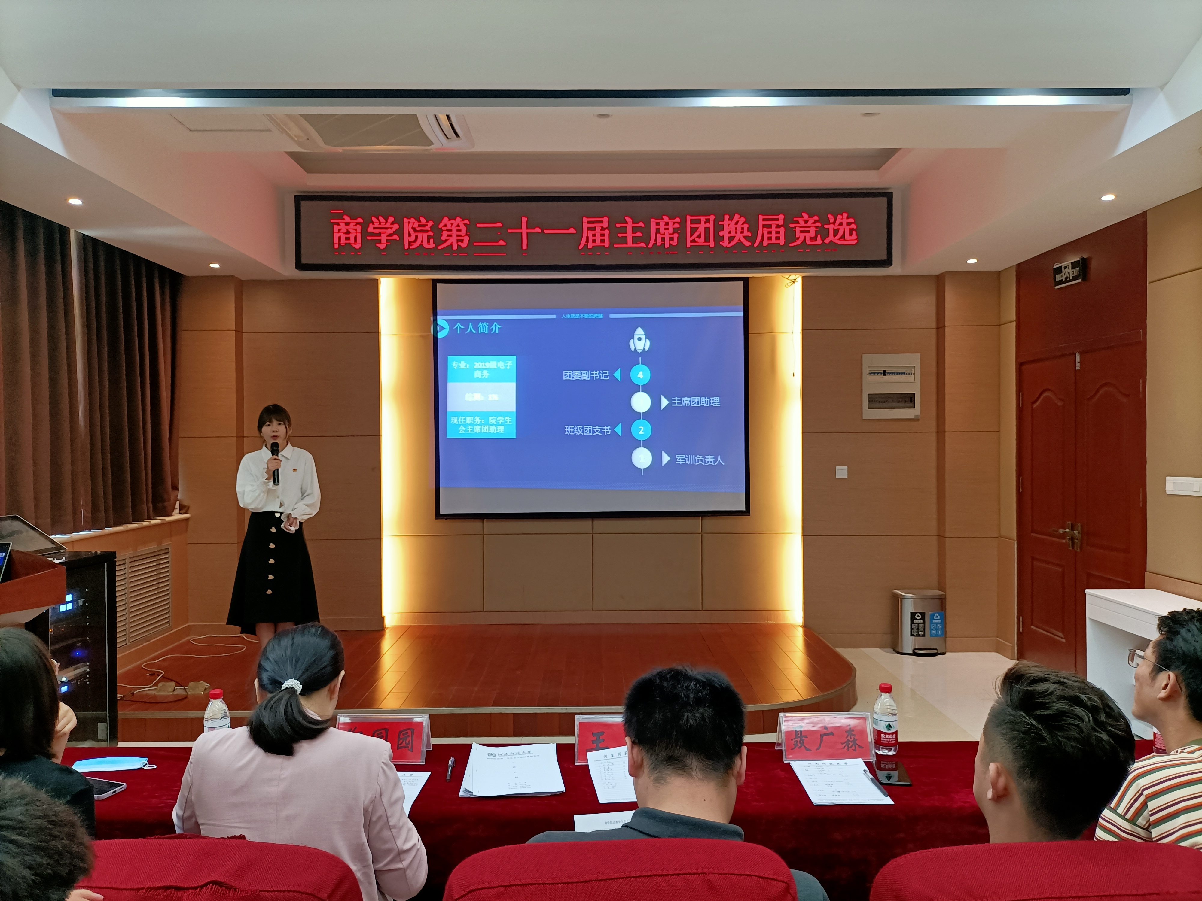 为选拔出新一届团委、学生会的中坚力量,高质、高量地完成各项工作,促进学院的持续稳定发展,5月24日中午,商学院于学院楼119报告厅举办第二十一届主席团换届竞选活动。学院相关负责人应邀出席,团委、学生会主席团成员及部分学生干部参加此次活动。