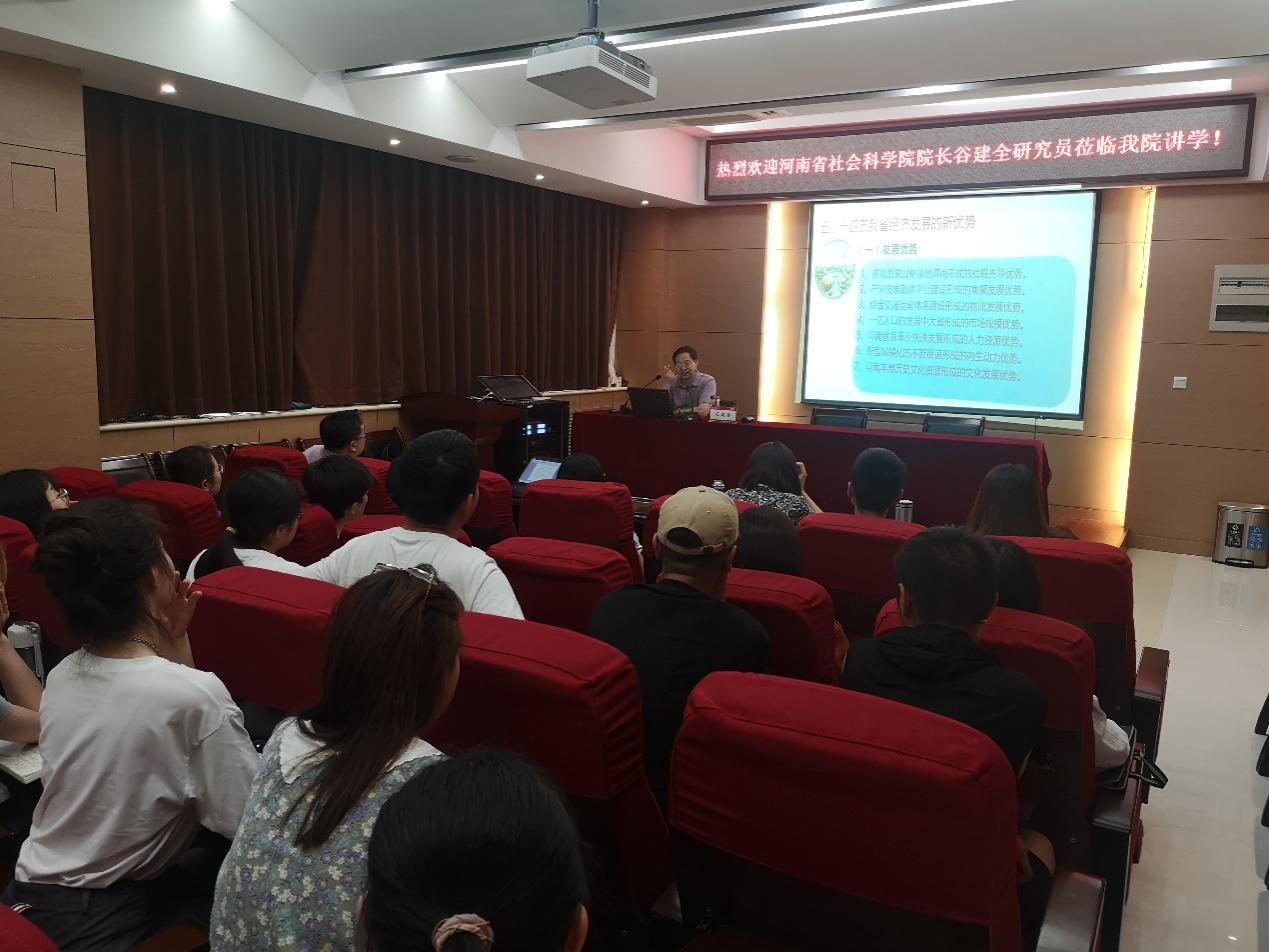 6月16日下午,受商学院邀请,河南省社会科学院院长、二级研究员谷建全在学院119会议室为师生作了一场以“十四五”经济发展新走向、新战略、新特征与新任务为主题的学术报告。学院领导班子、骨干教师和学生代表聆听此次报告。报告由学院院长杨玉珍主持。