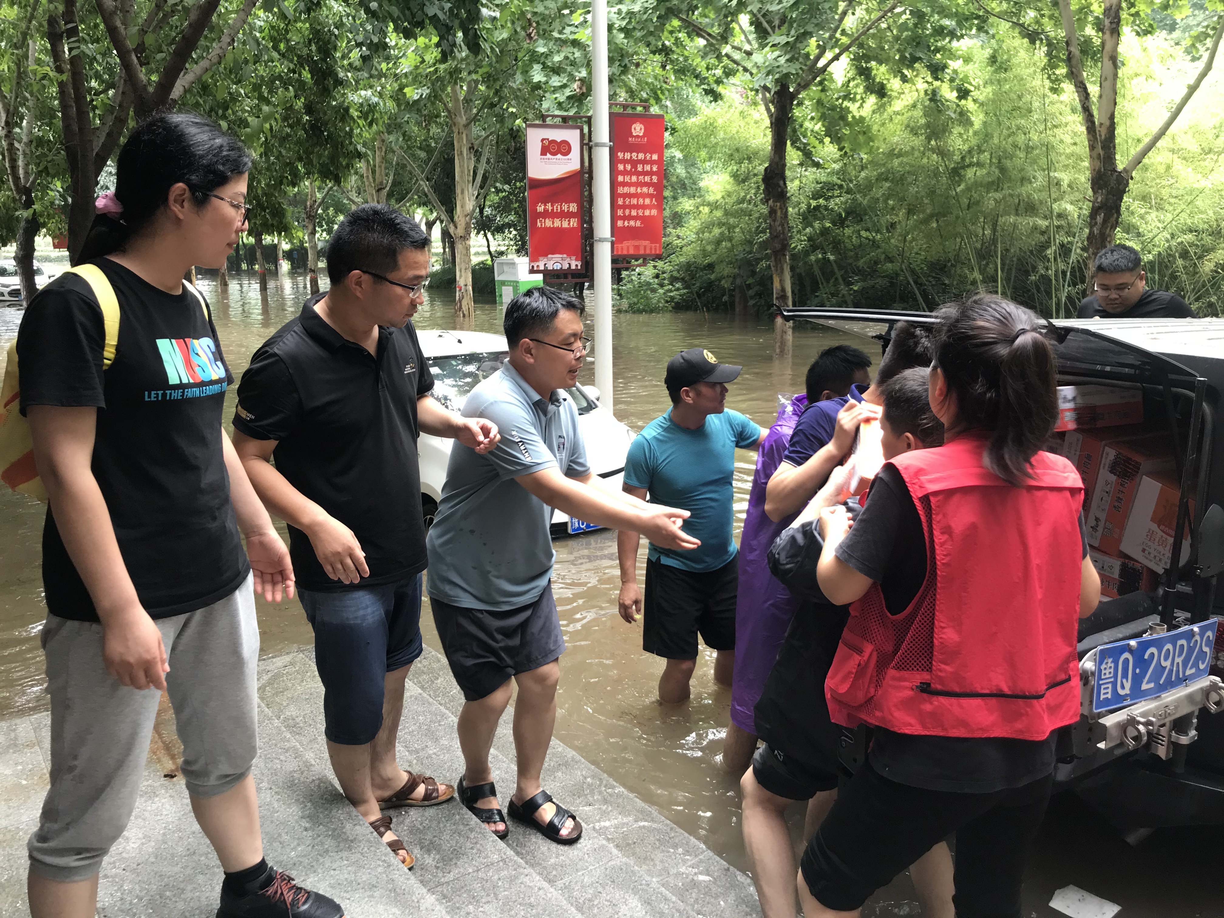 学院师生迅速行动,组成“党员突击队”,在防汛一线树旗帜、亮身份。“党员突击队”积极参与学校防汛巡堤查险工作,并在转移学生、运送物资等工作中克服一切困难,全力奋战。连日来,学院“党员突击队”通过人力、挖掘机、皮划艇、救援车等方式为在校生运送物资往返30余次,组织教师带队,通过人力、皮划艇、救援车等方式安全有序转移东区学生400余人,在防汛一线筑起一道坚强的堡垒。学院领导班子成员和政工干部第一时间深入学生宿舍,看望慰问转移学生,并全力为学生提供生活保障。